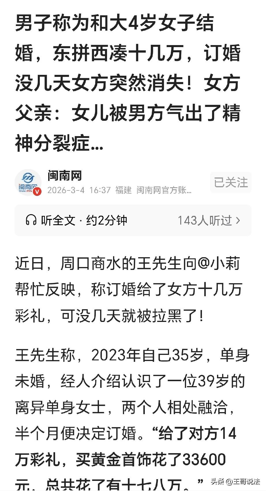 “太坑了!”河南周口,一35岁男子家境不好,母亲去世,父亲瘫痪,他为了结婚,和一39岁离异女订婚,为给彩礼,男子到处借钱,东拼西凑给了女子14万,金首饰花了33600元,总共花了十七八万,可没想到,女子钱一到手,立刻变脸,手机关机,拉黑男子,男子急了,找到女子村里,在墙上写女子和她父亲的名字,还拿喇叭在村里吆喝,父亲急了: 我女儿去上海找他,回来就神经了! 2023年,王先生35岁,他单身未婚,心里着急,他拖了媒人,给他介绍对象,不久之后,媒人给他介绍了一位39岁离异女子。 两人见面,感觉不错,半个月后,他们决定办理订婚仪式。 可订婚之时,需要给女方彩礼,王先生发愁,他的家里,可以说是家徒四壁。 他母亲去世,父亲又瘫痪在床,家里的生活,一直都在勉强维持。 他为了婚事,东拼西凑,好不容易凑齐了十几万的彩礼。 订婚的时候,他给了女方14万彩礼,又花33600元买了黄金首饰。 他一计算,前后花了有十七八万,这钱对他来说,都是他舍下了脸面,四处求人借来的钱。 但他一想,先结婚再说,只要能娶到媳妇,这笔钱可以慢慢再还。 可没想到,刚给完彩礼,女方立刻变脸,她不再热情,对王先生爱理不搭, 王先生没有多想,以为可能是订婚期间的情绪波动。 他喜气洋洋,就盼着订完婚后,下一步就是结婚,他喜欢女子,并不介意她大自己4岁的年龄。 可没有想到,女子把手机一关,玩了消失,V信把他拉黑,王先生再也找不到她。 王先生懵了,他想不明白,女方为何要这样,难不成她为了骗钱,拿到钱就不再装了? 王先生急了,家里本来就困难重重,为了礼钱,他不知求了多少亲戚朋友。 好在亲戚们给力,愿意帮助他结婚娶妻,他们纷纷拿出钱财,凑在一起,这才凑够了十七八万。 可是如今,如果女子跑了,他要怎么向亲戚朋友们交代? 为了搞清真相,王先生立刻联系了媒体,记者给女方电话,显示无人接听,之后,记者陪着王先生找到女子的父亲。 可父亲一见王先生,立刻就很生气,父亲告诉记者,女儿现在并不在家,之前女儿去上海找王先生,回来之后就不正常了。 原来,女子在10年之前,就患上了js分裂症,就是因为这个,她才接束了第一段婚姻。 经过一段时间的治疗,女子痊愈,可这件事早就过去,因此订婚时没有告诉王先生。 而女子父亲认为,女儿这次犯病,都是被王先生气出来的。 父亲还说,王先生来到村里,往墙上涂写女儿和自己的名字,他还拿着一个喇叭,在村里大声的吆喝,就是因为他的行为,这才把女儿气坏了,病情复发。 可王先生认为,是女子父亲在冤枉他! 王先生表示,女子去上海找他,凌晨三四点才给他发来了消息,可是他正在休息,睡醒之后,就发现联系不上女子。 他怕女子家里人担心,就给女子的妹妹说了此事,可是他没想到,女子因为这个就生气了。 可是不管如何,王先生认为,既然你玩消失,不愿意和我结婚,那么就请归还彩礼,彩礼是我辛苦借的,我要要还给各路亲戚。 其实,王先生已经留了后手,他就害怕女子拿着钱就是不还。 他拿出一张民事判决书,上面显示,判决被告返还原告彩礼款140000元。 有人认为,不同情,花高价彩礼买老婆的同情不起来。 也有人说,笑死我了,早不发病晚不发病,给完钱毛病都出来了,就是惯的! 那么,既然法院已经判女方归还14万元彩礼,如果不还,男子该咋办? 《民事诉讼法》2023修正版第二百四十三条规定:发生法律效力的民事判决、裁定,当事人必须履行,一方拒绝履行的,对方当事人可以向法院申请执行。 法院已判女方返还14万彩礼,女方拒不还钱,王先生可带判决书、身份证,向法院或女方财产所在地同级法院申请强制执行。 如果女方拒不执行,会被列为失信被执行人,限制高消费,情节严重的,要负刑事责任。 对此,你怎么看?