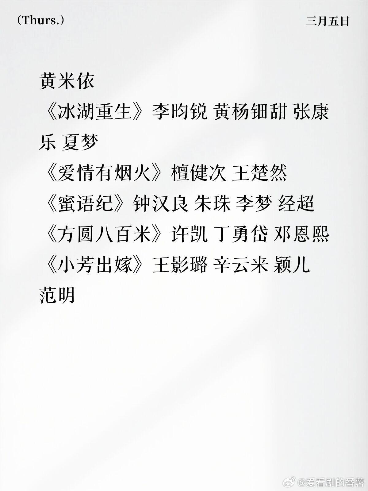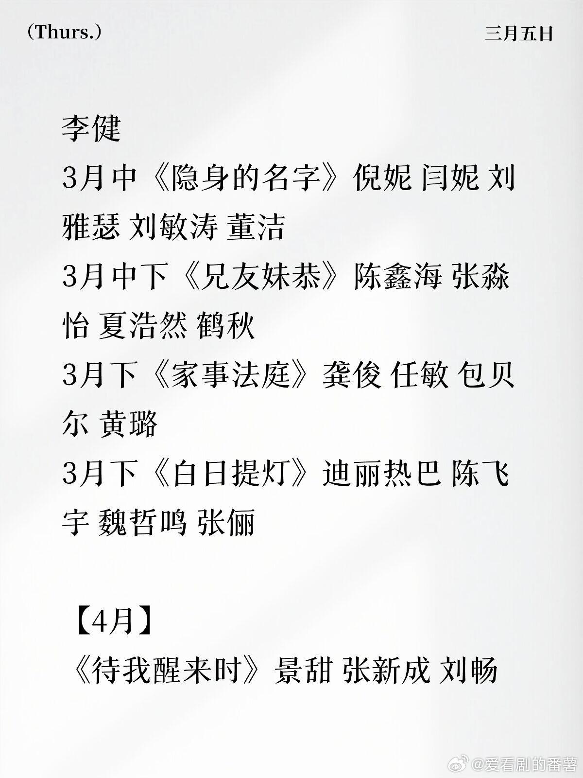 🐧腾讯排播更新【2月】2.26《玫瑰丛生》王子文 刘宇宁 蒋欣 明道【3月】3.6《逐玉》张凌赫 田曦薇 任豪 孔雪儿3月上《盛怒》马思纯 宁理 袁姗姗 翟子路3月中《叵测》刘烨 聂远 王佳佳 李健3月中《隐身的名字》倪妮 闫妮 刘雅瑟 刘敏涛 董洁3月中下《兄友妹恭》陈鑫海 张淼怡 夏浩然 鹤秋3月下《家事法庭》龚俊 任敏 包贝尔 黄璐3月下《白日提灯》迪丽热巴 陈飞宇 魏哲鸣 张俪【4月】《待我醒来时》景甜 张新成 刘畅 黄米依《冰湖重生》李昀锐 黄杨钿甜 张康乐 夏梦《爱情有烟火》檀健次 王楚然《蜜语纪》钟汉良 朱珠 李梦 经超《方圆八百米》许凯 丁勇岱 邓恩熙《小芳出嫁》王影璐 辛云来 颖儿 范明
