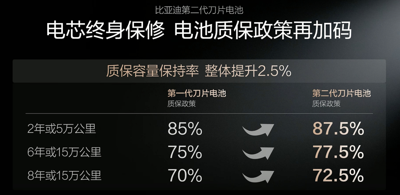 比亚迪第二代刀片电池不仅充的快,安全性能也是相当不错,通过了远超新国标的最高 1500J 底部撞击测试。相应的,电池质保政策也升级了,在原有质保周期的基础上,将各阶段的容量保持标准都提升了2.5%,还推出了电芯终身保修的政策。既是比亚迪实力的体现,也是其自信的体现比亚迪闪充