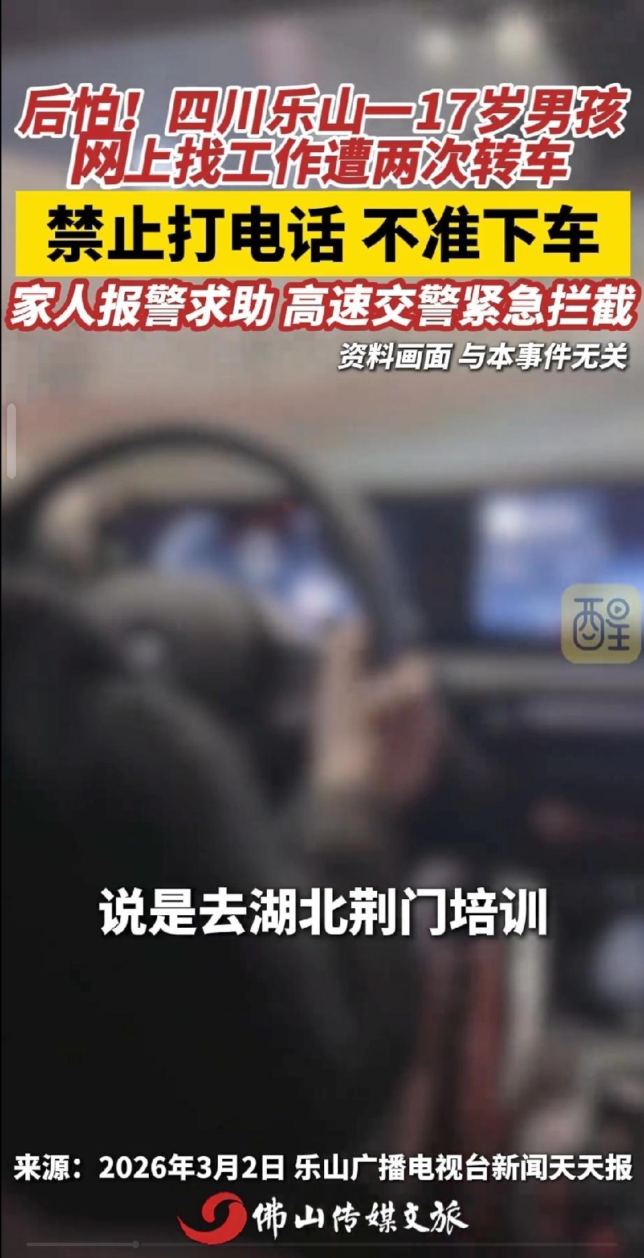 “太吓人了”!四川乐山一名17岁男孩只是想在网上找份保安工作,竟被人一步步诱骗上车,连续转车两次,全程被限制通话,不准打电话不准下车,稍有反抗就会被呵斥,如果不是家人警觉及时报警,如果不是高速交警连夜拦截,后果真不敢想 找工作差点断送自由,多少年轻人,都栽在了这不起眼的网络招聘上。 四川乐山一名17岁少年,只是想打份短工贴补家用,却一步步走进了陌生人布下的圈套。 如今回想整个过程,连家人都忍不住后怕,稍有差池,后果不堪设想。 2026年3月,假期里的少年想靠自己的双手赚点零花钱。 他随手在社交平台浏览招聘信息,一条保安岗位的广告,让他动了心。 招聘方宣称工作轻松、薪资稳定,还承诺统一安排异地岗前培训,全程免费。 涉世未深的孩子,根本分辨不出其中的猫腻,只觉得这是一份安稳的好工作。 对方全程态度温和,没有索要押金、报名费,一步步降低少年的防备心。 按照对方的指引,少年没有和家人细说,独自按照约定时间前往乘车点。 3月2日下午,少年坐上了对方安排的私家车,上车的瞬间,他就察觉了异常。 车上没有其他应聘者,司机全程沉默,只催促尽快驶入高速,绝不透露目的地。 行驶不久,车辆停靠在高速旁,少年被强制要求换乘大巴,这是控制的开始。 大巴上坐着好几个和他年纪差不多的孩子,全都面色紧张,无人敢说话。 看管人员态度强硬,当场收缴所有人的手机,严禁与外界联系。 不许打电话、不许发消息、不许擅自下车,反抗就会被严厉呵斥。 少年吓得浑身发抖,只能假装顺从,找准空隙,偷偷给家人发送了定位。 他只简单写下自己被控制,消息断断续续,却成了唯一的救命信号。 家人看到信息后,立刻拨打孩子电话,刚接通就被强行挂断,反复拨打均被拒接。 家人瞬间明白,孩子不是去培训,而是被非法控制,当即选择报警求助。 警方接到报警后,立即启动联动机制,联合高速交警展开紧急救援。 此时大巴车已经驶离乐山境内,在高速上持续行驶,距离越来越远。 深夜的高速气温极低,民警根据实时定位,一路追踪,不敢有任何停顿。 他们精准分析行车路线,在关键路段层层布控,只为最快速度截停车辆。 经过数小时的连夜追击,3月3日凌晨,警方终于锁定目标大巴车。 在高速路段成功将车辆逼停后,民警迅速上车,控制了所有看管人员。 被解救的那一刻,少年再也忍不住情绪,眼眶通红,长时间的恐惧终于释放。 他说自己全程不敢哭闹,只能默默忍耐,生怕激怒对方,遭遇更危险的对待。 经检查,少年身体并无外伤,只是长期处于紧张状态,精神受到了不小的惊吓。 与他一同被解救的,还有多名同样被诱骗的青少年,均平安无恙。 目前,涉案人员已被警方依法控制,案件正在进一步深挖办理中。 这件事,给所有家长和青少年敲响了警钟,网络招聘的陷阱远比想象中隐蔽。 很多骗子打着高薪、轻松、包吃住、异地培训的旗号,专门瞄准涉世未深的年轻人。 一旦要求单独乘车、多次转车、没收手机、限制人身自由,必定是骗局。 青少年找工作,一定要通过正规企业、官方平台,切勿轻信陌生信息。 出门务工前,务必告知家人行程,遇事多商量,不要独自做决定。 有网友感慨,现在的诈骗手段越来越隐蔽,温柔的话术背后,全是算计。 也有家长表示,平时总觉得孩子长大了,却忘了社会复杂,人心难测。 我们总以为危险离自己很远,可一旦发生,就是整个家庭的灾难。 保护孩子,不只是衣食无忧,更要教会他们识别危险,守住安全底线。 平安从来都不是小事,多一分警惕,就少一分危险,这是最朴素的道理。