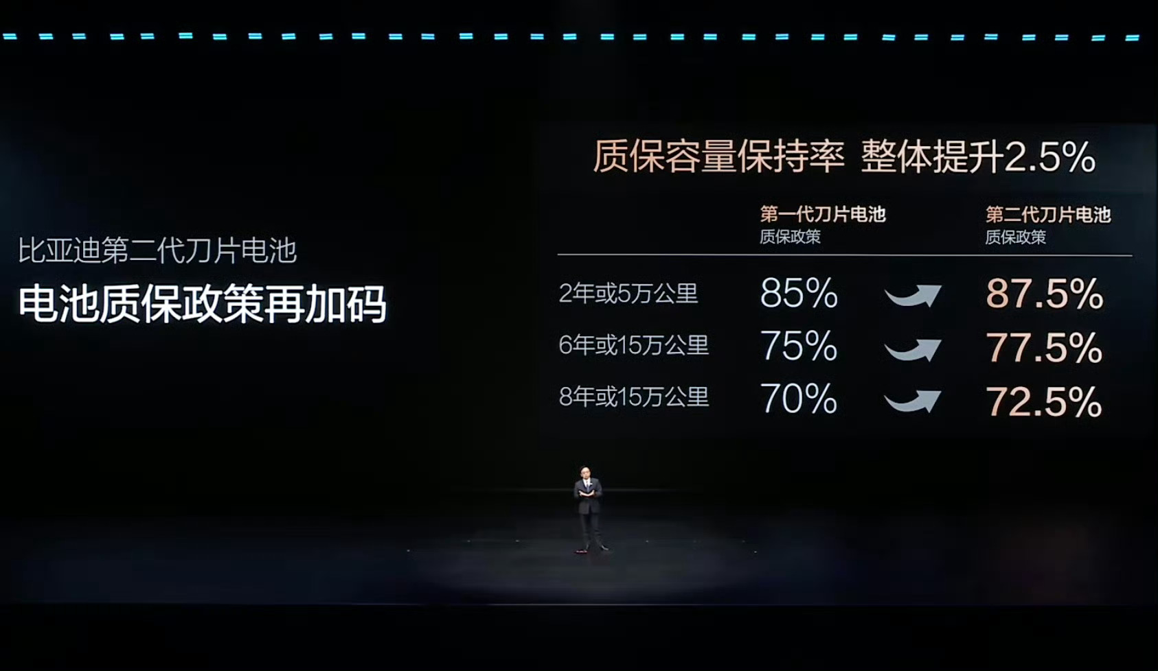 今天看比亚迪的这个发布会看得我热血沸腾啊,这技术怎么能如此如此牛!就比如比亚迪的二代刀片电池,为什么说它牛,单看质保就知道了。相比于一代刀片电池的质保,二代的质保又升级了——6年或15万公里内,电池容量只要掉到77.5%以下,直接给换!比之前标准还低了点,等于给你吃了颗“长效定心丸”。