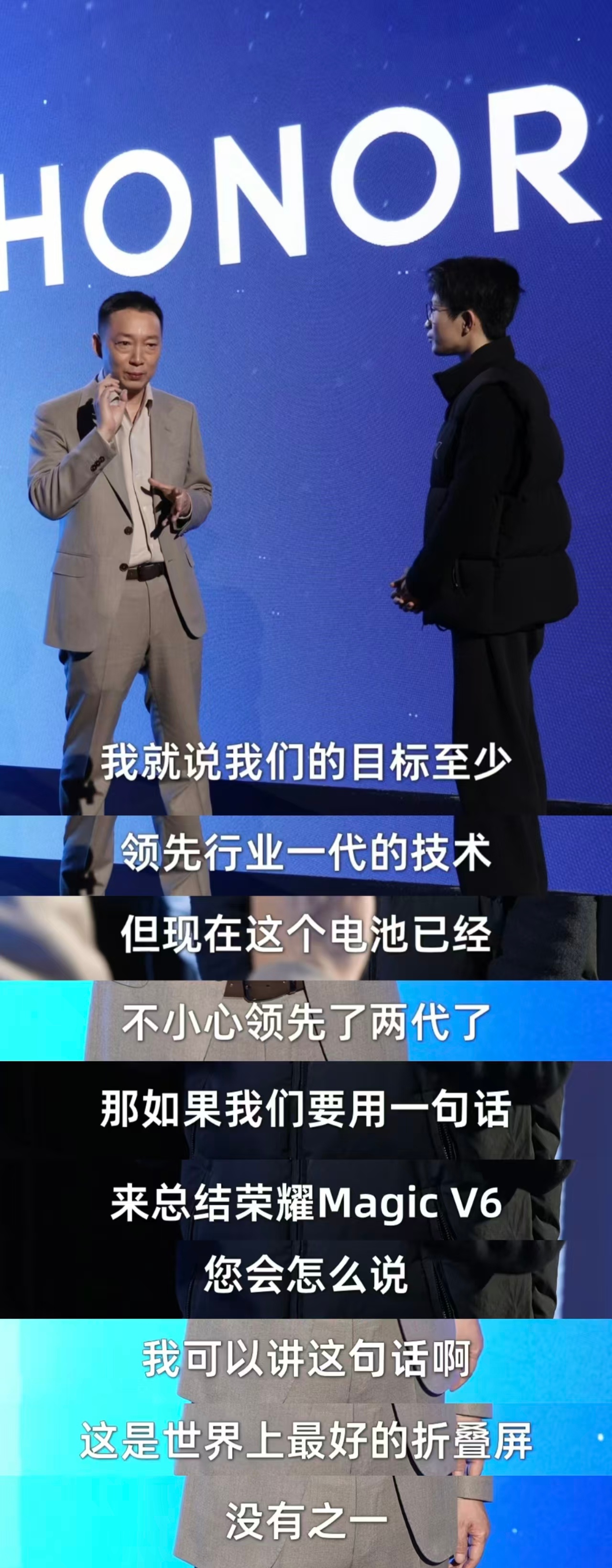 荣耀Magic V6不小心领先了两代荣耀这波直接炸场!MWC 上何同学和李健对谈折叠屏核心技术,直接摔了Magic V6,没想到一出手就领先行业两代,还正式开启折叠屏7000mAh 时代! 荣耀自研青海湖刀片电池拿下GLOMO 最佳突破创新奖,实力直接被全球认可!Magic V6 凭借7150mAh 超大电池搭配8.75mm 极致轻薄机身,轻薄和续航直接拉满,这技术实力真的断层领先! 我感觉这就是折叠屏行业的天花板!之前大家都在卷轻薄、卷续航,现在荣耀直接把两项痛点全解决,接下来就看谁能跟上这种技术节奏了!中国硅碳电池获GLOMO大奖