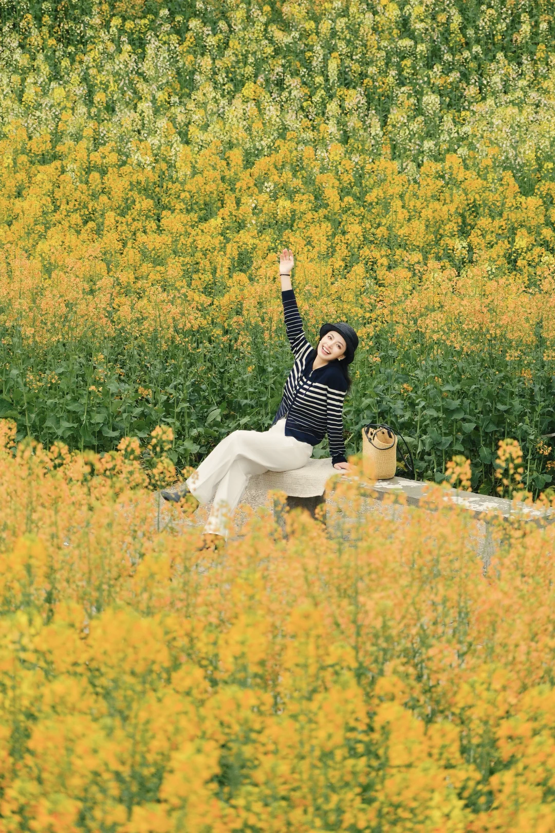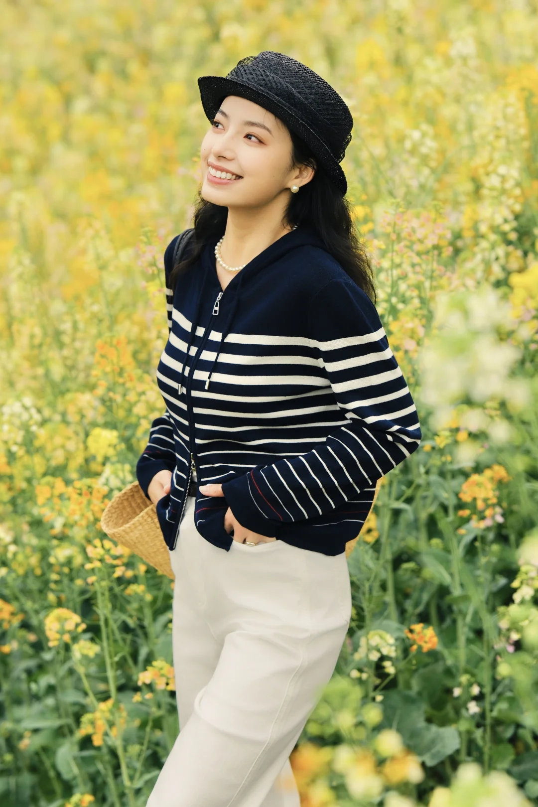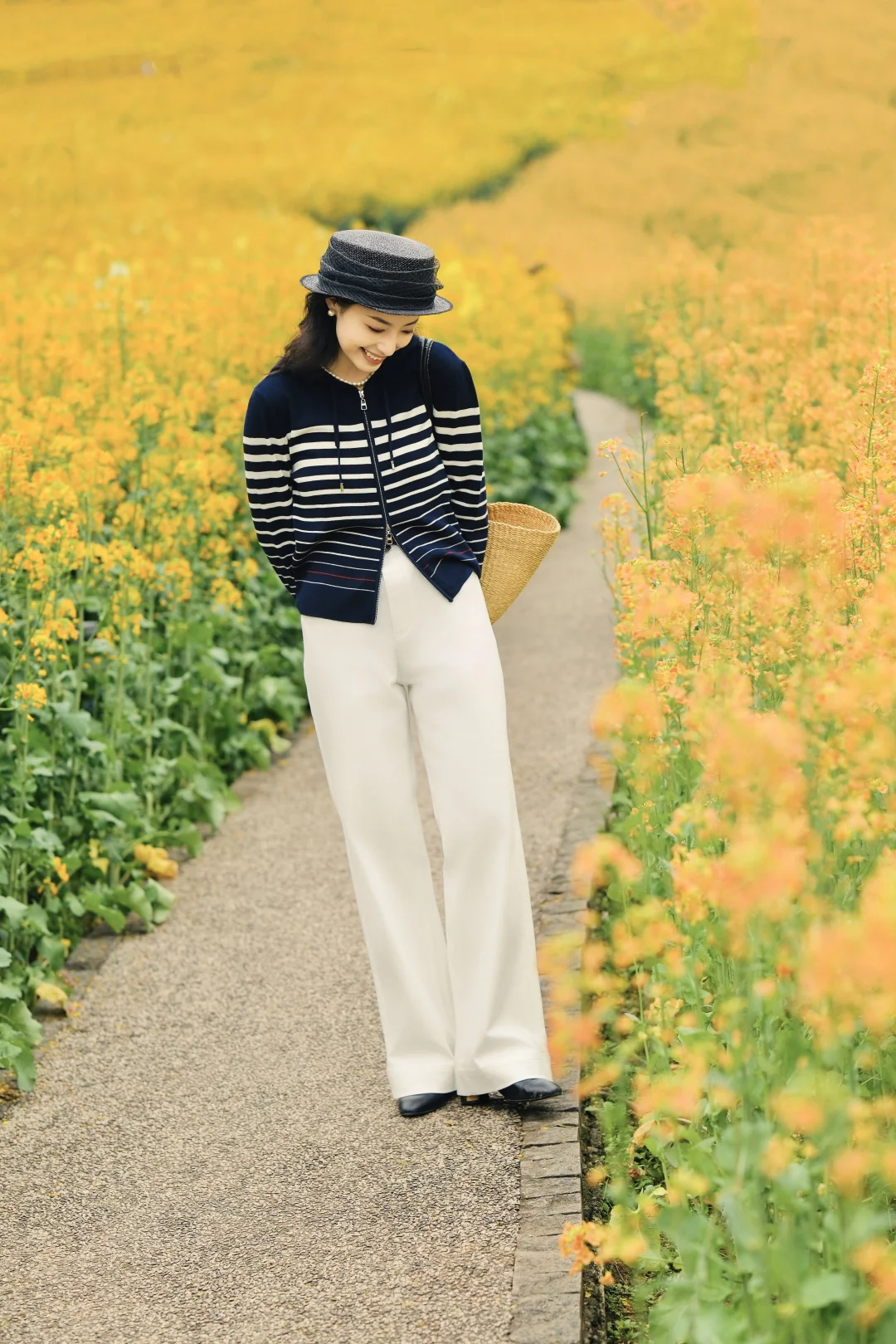 另一套更适合春日踏青野餐,藏蓝色的条纹针织衫搭配白色牛仔裤,休闲又利落。在花海里拍照会更有随意走进一片公园的松弛感