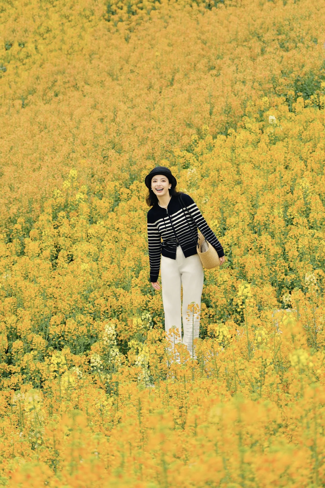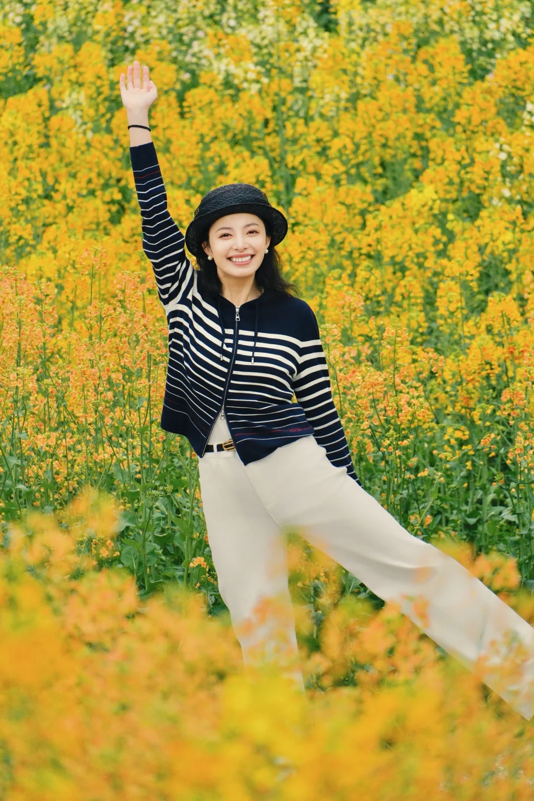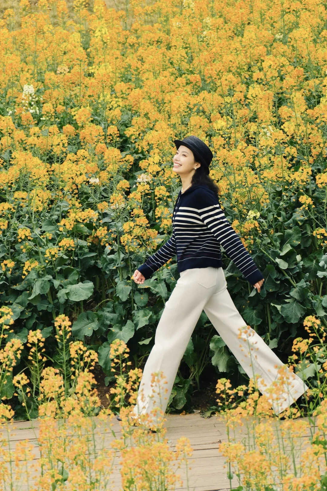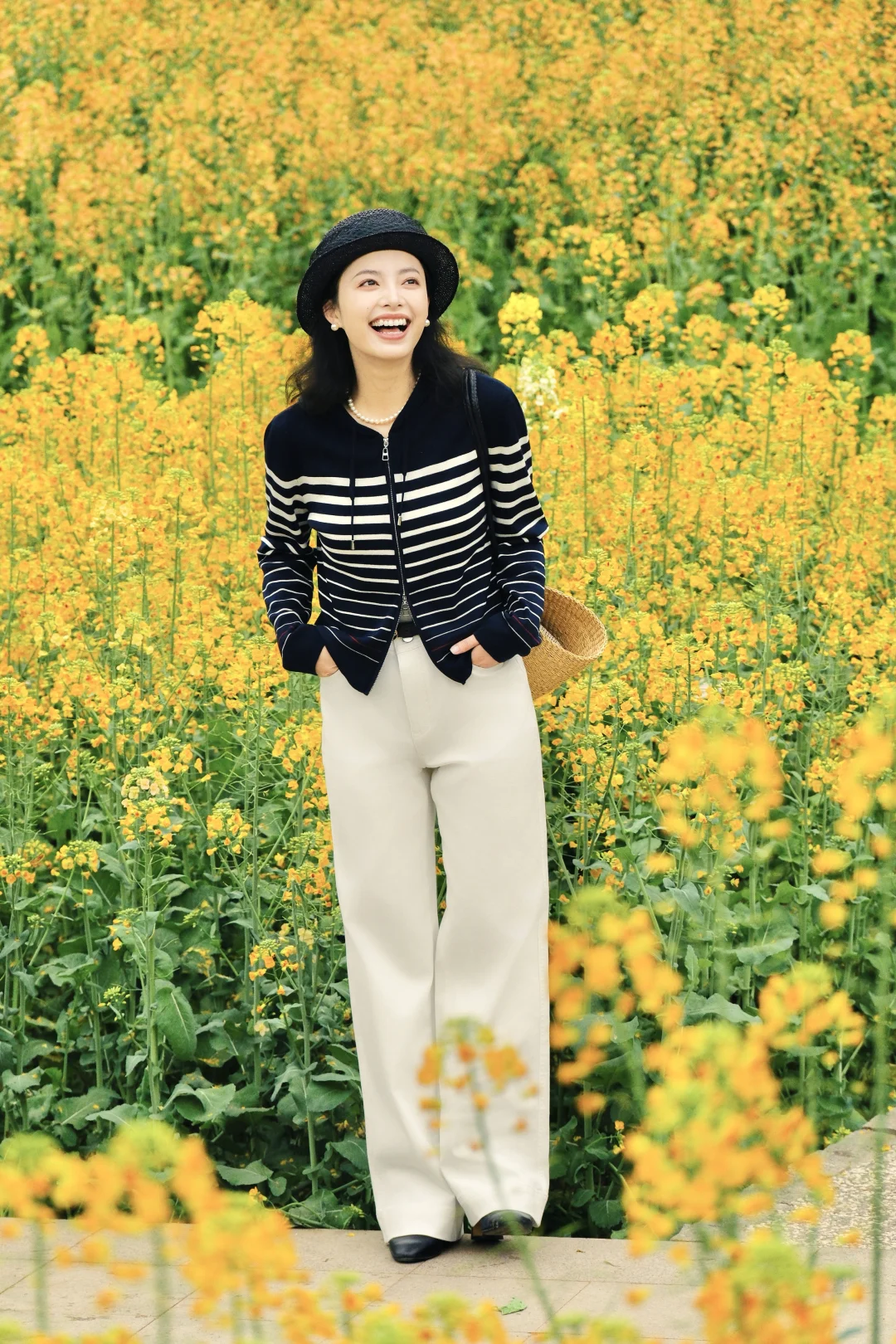 另一套更适合春日踏青野餐,藏蓝色的条纹针织衫搭配白色牛仔裤,休闲又利落。在花海里拍照会更有随意走进一片公园的松弛感