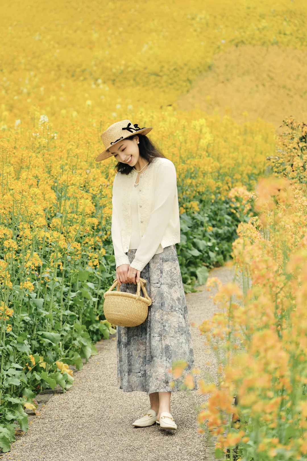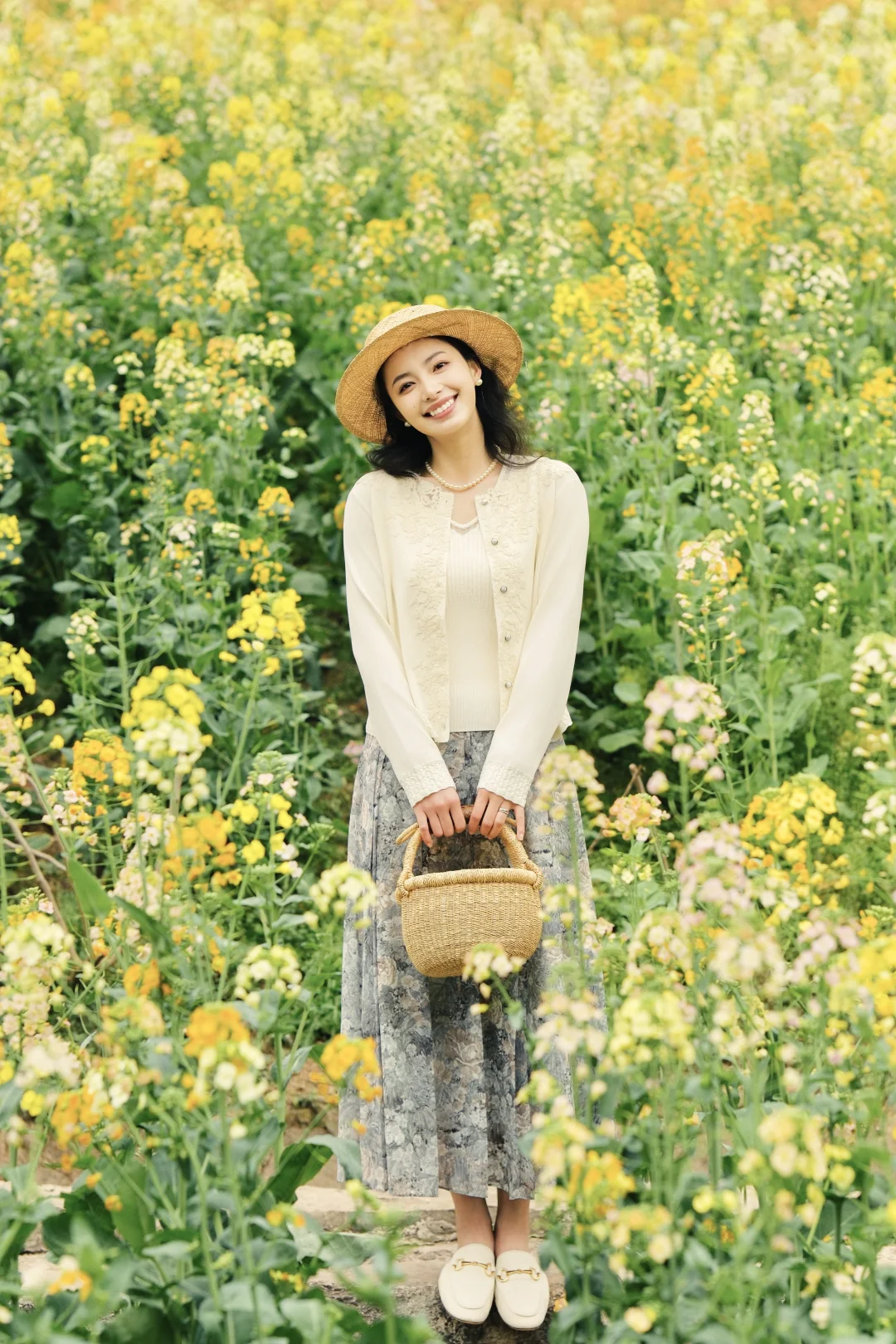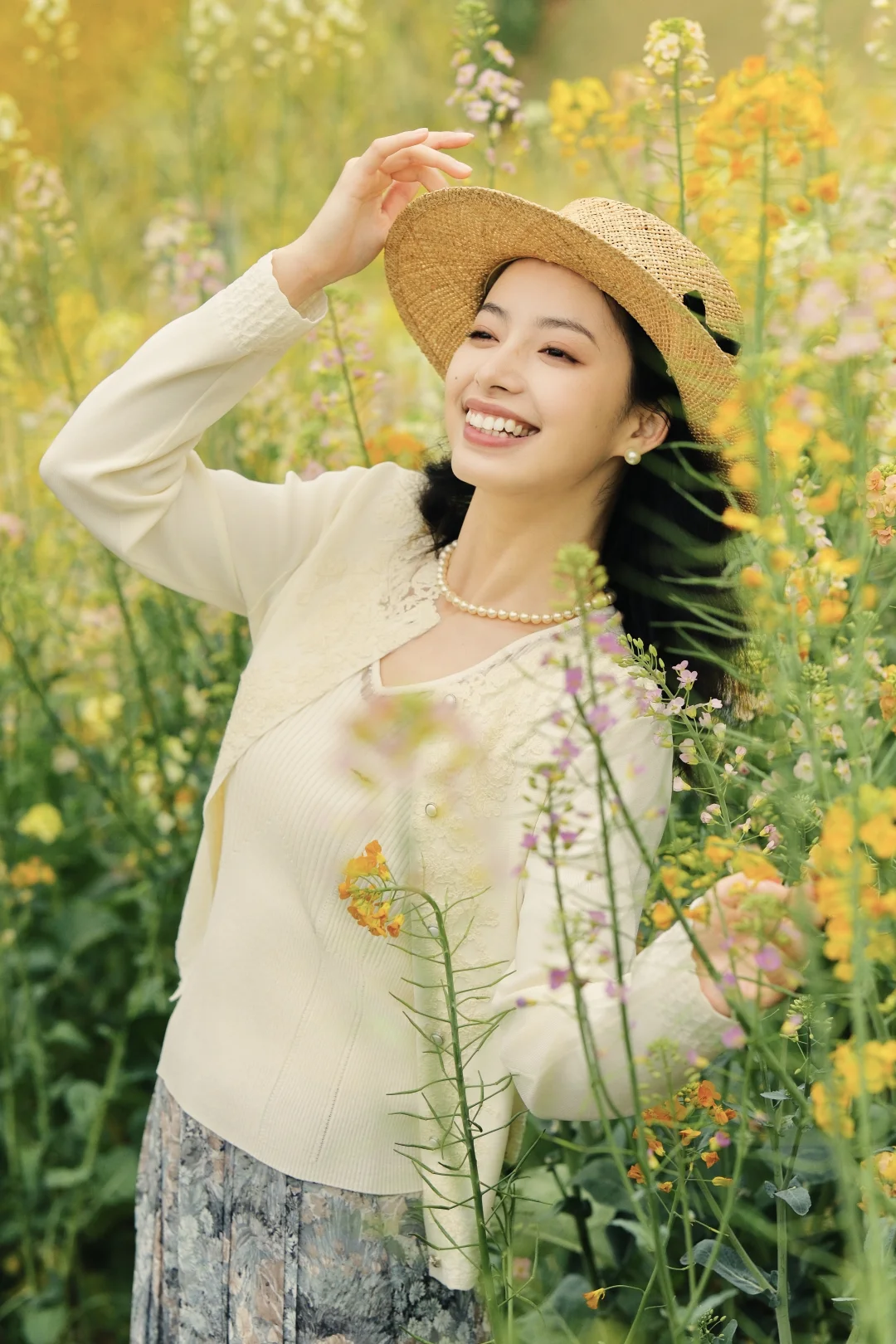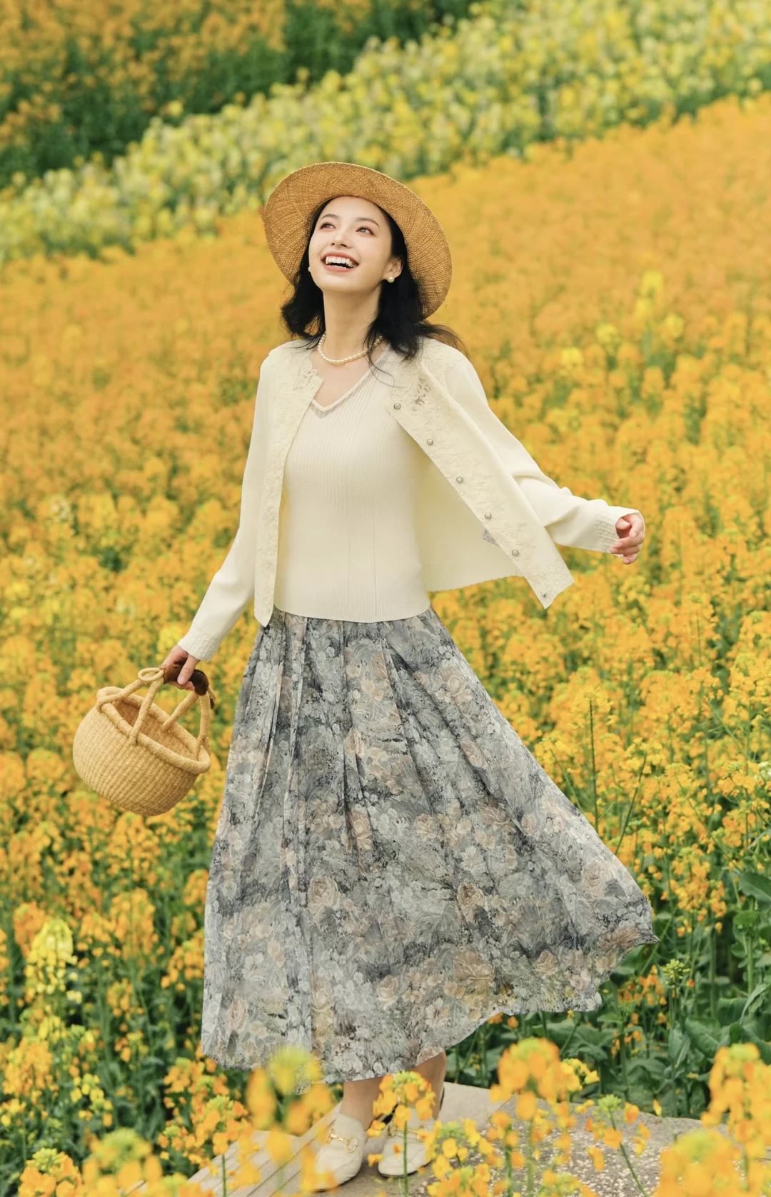 搭配了玖姿的春日系列,白色针织衫搭配印花半裙,衬得人温柔又浪漫,针织衫上的提花刺绣与裙摆上的花朵随着我在花间穿梭,变得灵动又优雅