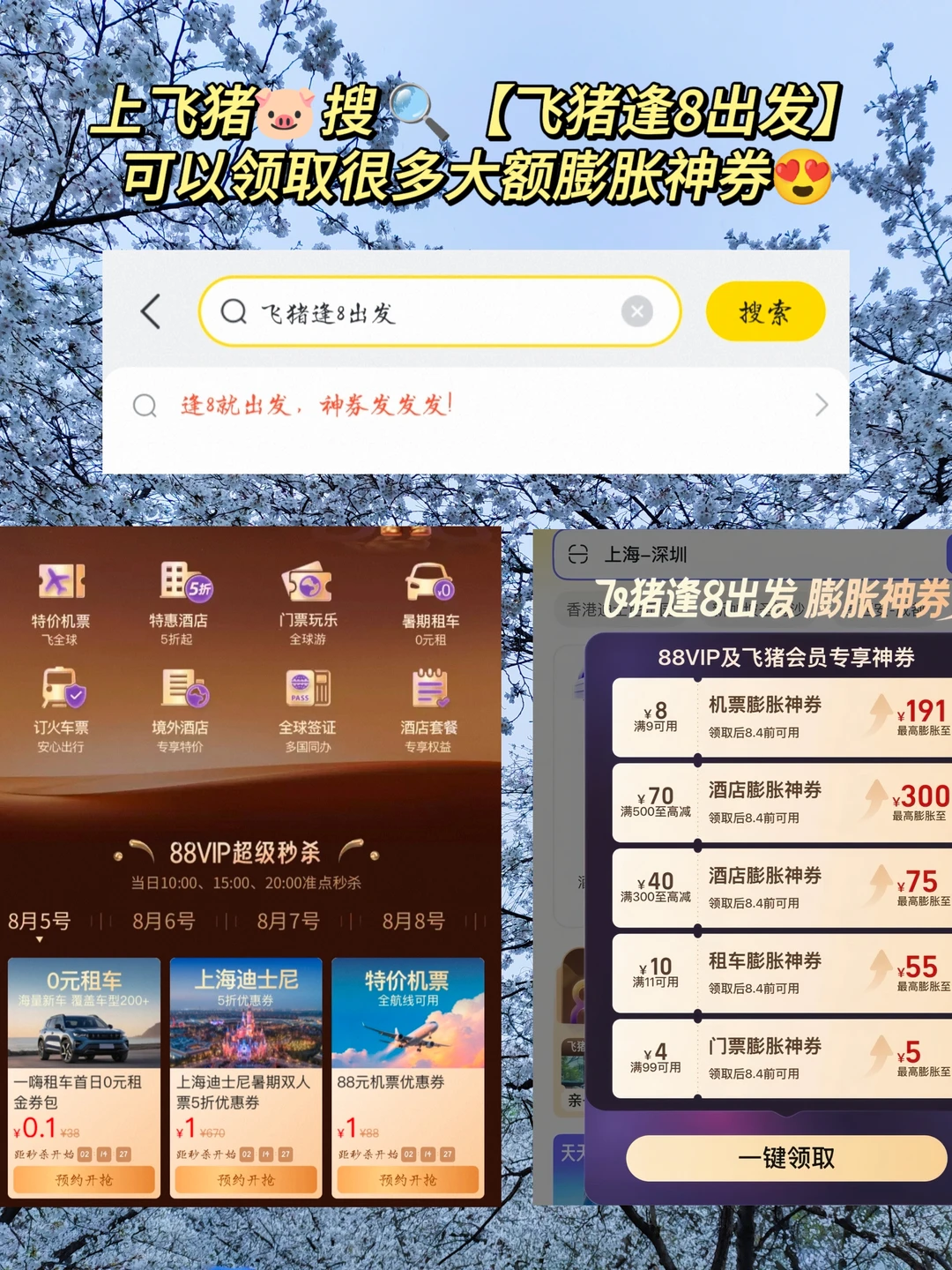 订酒店之前可以先来薅一波飞猪🐷的羊毛,飞猪暑期推出了88vip活动,88VIP或飞猪f4及以上会员可以上淘宝/飞猪搜🔍【飞猪逢8出发】,进入页面后领取专属88VIP/飞猪f4及以上会员的旅行福利🎁, 内含大额酒店膨胀神券🎫和一些其他的丰富权益🌸