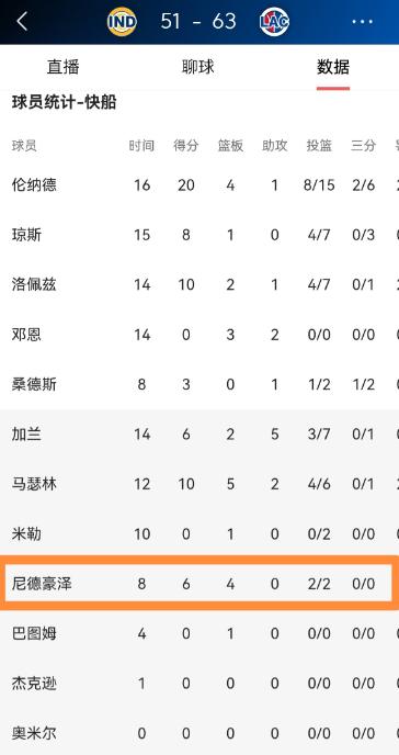 快船新秀尼德豪泽真是太让人惋惜了!在今天快船主场迎战步行者的比赛中,目前双方的上半场比赛已经结束,快船以63:51领先对手12分。让人感到特别惋惜的是,在前两节比赛中,尼德豪泽在状态非常出色的情况下不慎受伤离场,他在替补出战的8分钟里,投篮2中2,其中罚球2中2得到6分4篮板2盖帽,没有出现任何的失误和犯规,他的场上正负值为+14。 这场比赛里,尼德豪泽是替补出场的,上场之后状态一直很好,不管是进攻还是防守,都做得很到位,能明显看出来他手感正热,在场上的作用也很大。 就在第二节的一个防守回合,他上去封盖步行者球员内史密斯的上篮,完成封盖之后落地的时候出了意外。 落地瞬间,他的右脚没站稳,以不正常的角度碰到地板,当时就倒在了地上,看得出来特别疼,还忍不住用手拍了拍地板,以此发泄疼痛感。 他试着起身,却发现右脚根本不敢用力,没法自己站起来,之后在对手球员的协助下勉强起身,又被工作人员搀扶着慢慢走回更衣室,全程右脚都没有承重。 快船官方很快就宣布,尼德豪泽因为右脚受伤,本场比赛不会再回归。 据了解,他之后不会随队前往接下来的两个客场,至少会缺席两场比赛,并且会在第二天接受进一步的核磁共振检查,来明确具体的伤情,看看有没有韧带损伤或者骨折的情况。 尼德豪泽是2025年的首轮新秀,本赛季慢慢在快船站稳了脚跟,尤其是最近几场比赛,表现越来越出色,还得到过主帅泰伦卢的点名表扬。 他的身高和臂展很有优势,在防守端能很好地守护禁区,进攻端也能高效完成终结,和球队新援的配合也已经有了起色。 本来他正处于上升阶段,一点点打出自己的价值,这次受伤不仅中断了他的良好势头,也给快船的内线轮换带来了考验。 毕竟现在是季后赛冲刺的关键阶段,球队内线本身就有球员受伤缺阵,他的缺席会让内线用人更紧张。 虽然这场比赛快船最终赢了,但尼德豪泽的受伤还是让这场胜利打了折扣。 目前大家都在等待他的检查结果,希望只是普通的扭伤,能尽快康复,重新回到赛场,继续展现自己的实力。 以上都是个人观点,对此您有什么不同的看法,可以在评论区留言讨论!!!