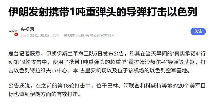 导弹击中特拉维夫那天,以色列的防空系统没拦住,白宫电话被打爆了,盟友之间开始互相猜忌 3月5日,伊朗发射了一枚远程导弹,弹头重达1吨,击中特拉维夫,央视网确认了这一消息,以色列部署了七层防空系统,但全部未能拦截,这不仅暴露技术漏洞,更让人意识到所谓铁穹与爱国者组合的防御体系并非坚不可摧。 就在同一天,以色列情报部门截获了一段奇怪的通信信号,怀疑美方有人私下和伊朗商量停火的事,内塔尼亚胡立刻打电话到白宫,语气显得很着急,白宫方面回应说没有正式会谈,但也没有否认有过非正式接触,这种回答听起来就有点含糊,如果真的没有这回事,直接回一句“全是谣言”反而更干脆。 往前数两天,二月二十八日,美国和以色列一起空袭了伊朗,以色列那边给出了哈梅内伊的行程情报,但美国政府只说这事影响了打击时机,强调动手是因为预判伊朗要打美军的资产,可问题在于,就在二月二十六日,特朗普政府还派特使悄悄给伊朗传话,想谈点事情,一边准备打仗,一边又递出橄榄枝,这做法显得自相矛盾。 现在是2026年3月6日,战事进入第七天,伊朗方面宣称打击了中东地区27个美军基地,而美军则表示已经摧毁超过2000个目标,五角大楼正在计划申请500亿美元用于补充军备,这笔款项的规模表明实际消耗速度远高于预期。 以色列的目标很清楚,这次要把伊朗的核武器和导弹能力彻底清除,最好还能推翻伊朗政府,内塔尼亚胡自己在国内面临很多法律问题,他急需一场胜利来稳住自己的地位,但美国不这么看,美国只想打掉伊朗的导弹库、海军和一部分核设施,绝对不想进行地面战,更不愿意再陷入像伊拉克那样的长期困境。 以色列把情报共享当成合作的基础,美国却把它当作单向工具,你提供信息,我来决定打不打、怎么打,两边的目标根本对不拢,说好听是战略差异,说白了就是各怀心思。 白宫嘴上否认会谈,但没有堵死所有后门,第三方中介、情报试探、危机管控对话这些灰色操作其实常见,对以色列来说,哪怕只是疑似接触,也等于被背后捅刀,他们太依赖美国了,一丁点风吹草动都怕是抛弃信号。 伊朗威胁要封锁霍尔木兹海峡,这个通道承担着全球五分之一的石油运输,一旦封锁,油价就会迅速上涨,美国通胀问题本就不稳定,加上2026年中期选举临近,美国政府不敢放任油价失控,因此只能控制局势,宁愿让以色列受点委屈,也要避免选票受影响。 国内民众的态度也在拖后腿,美国民调显示只有27%的人支持对伊朗动武,民主党选民里反对的比例超过七成,纽约和洛杉矶街头天天有人游行抗议高喊“别开战”,这种声音不是摆设,它会推动政策发生转向。 以色列内部的情况不太平,媒体还在不断喊口号,但普通民众已经开始私下讨论这场战争会持续到什么时候,内塔尼亚胡的支持率已经出现波动,战争不是游戏,它消耗的是资金、生命和人们的耐心。 美军的武器系统正在快速消耗,爱国者和铁穹这类装备每使用一次就减少一批零件,五百亿的预算听起来很多,其实维持不了多久,更麻烦的是,伊朗的导弹生产能力和无人机集群战术,比美国和以色列预计的要强得多,这不是一次性的报复行动,而是持续不断的反击。 说到底,以色列的安全完全依赖美国,但美国这些年越来越按照自己的方式做事,尤其在选举时期,国家利益总是排在盟友需求前面,伊朗这次的反击,表面是军事行动,实际上是一场心理较量,它打破了美国和以色列不可战胜的神话,也让以色列明白一个道理,当美国觉得代价太高时,以色列就可能被当作谈判的筹码。 内塔尼亚胡急着打电话质问,不只是因为眼下的战况,更像是提前体会到被冷落在一旁的慌张,棋手与棋子之间的关系从来就不平等。 2003年美国打伊拉克之前,也对以色列说大话,承诺要彻底解决萨达姆政权,结果呢,政权换了,稳定没来,美军最后只好撤走,现在美国又用上类似的办法,进行有限打击,留好退路,不求根治问题,历史没有重复,只是换了个时间和地点,继续上演。 1982年黎巴嫩战争的情况也差不多,美国先默许以色列打击巴解组织,等到阿拉伯世界快要翻脸的时候,又赶紧逼着以色列军队撤走,这种老套路反复使用,不是因为他们忘了,而是觉得还能勉强应付过去。