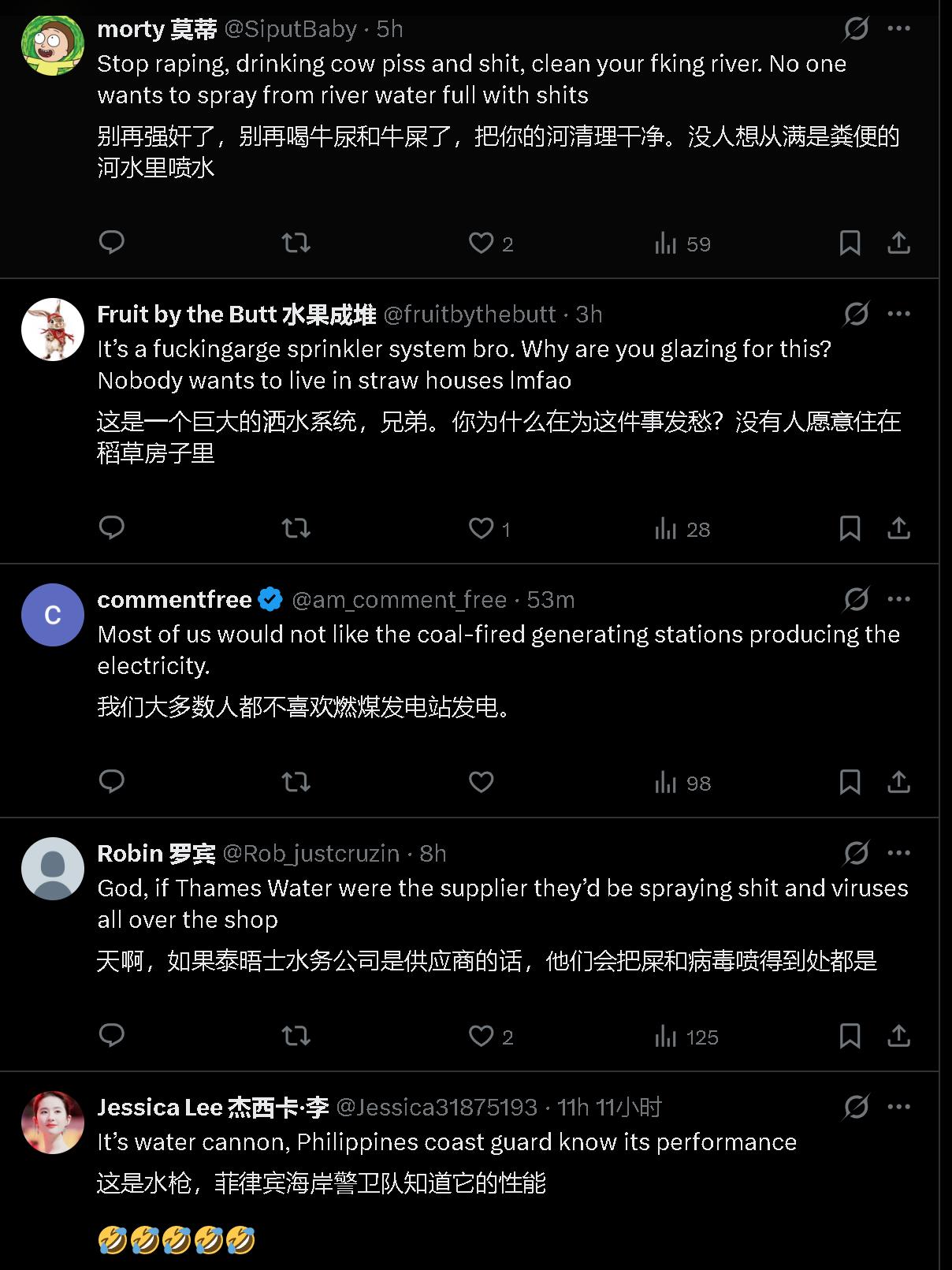 阿三网友嘲讽:是什么阻止我们像东大一样发展农村? 伊朗网友:因为你们正忙着通过尿尿治疗癌症。 别的网友: 别再强奸了,别再喝牛尿和牛屎了,把你们的河清理干净。没人想从满是粪便的河水里喷水。 这是一个巨大的洒水系统,兄弟。你为什么在意这件事?没有人愿意住在稻草房子里。 天啊,如果印度泰晤士水务公司是供应商的话,他们会把屎和病毒喷得到处都是。 这是水枪,菲律宾海岸警卫队知道它的性能。