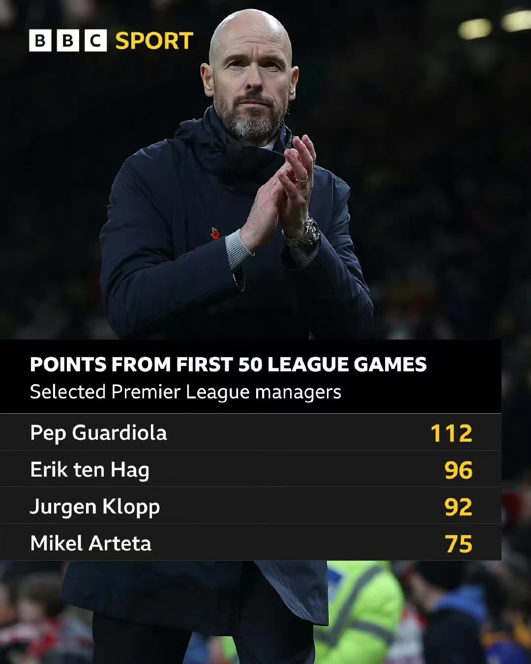 高于同期的克洛普和阿尔特塔!滕哈格执教曼联前 50 场