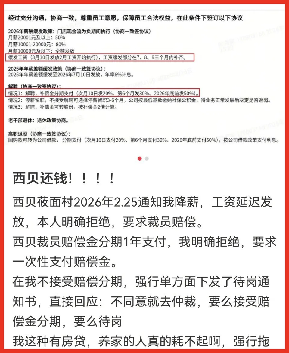 啊,西贝员工去年不还“一碗汤换一套房”“刷完7年赚100多万”嘛……今年咋就降薪、迟发工资、分期赔偿、待岗了?