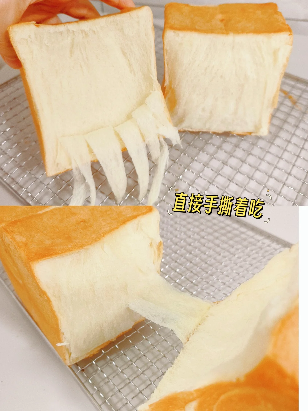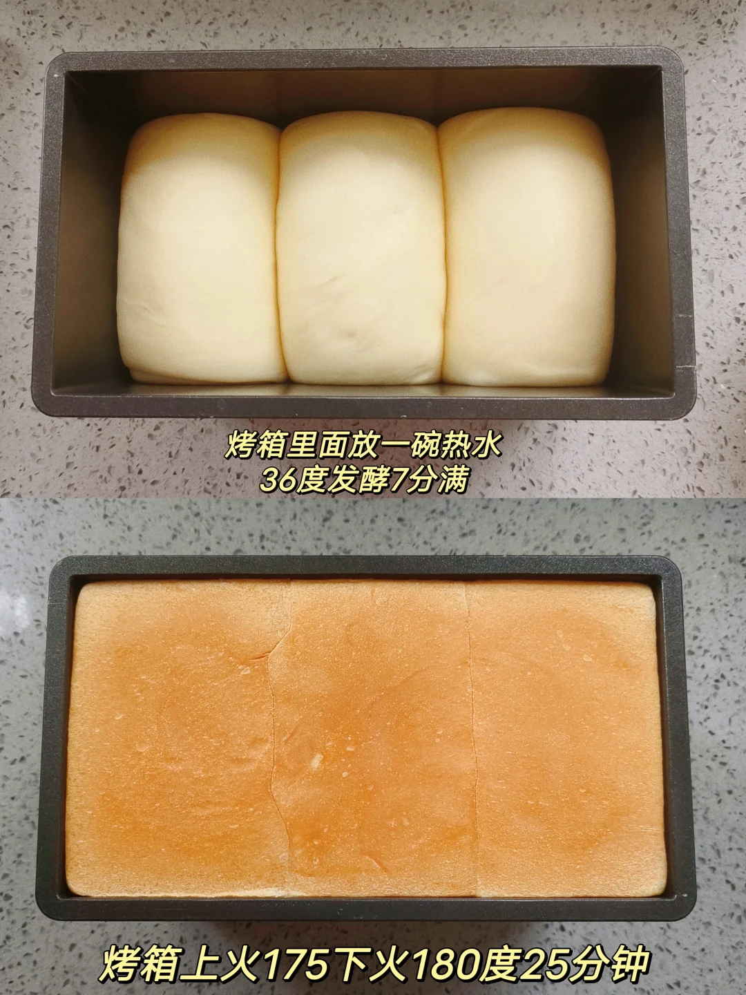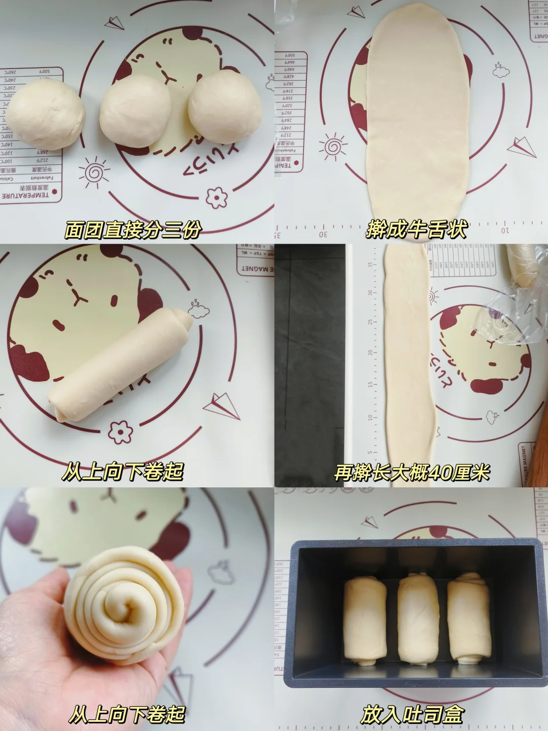 3.取面团擀成牛舌状,翻面从上向下轻轻卷起,盖保鲜膜松弛15分钟,面团继续擀长,从上向下卷起,放入模具,烤箱里面放一碗热水,36度发酵7-8分满,烤箱上火175度下火180度烘烤25分钟。出炉震一下热气,脱模晾凉。