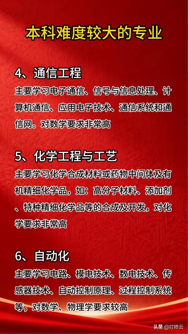 6个最难最大的本科专业汇总揭秘!26年高考志愿填报:选对专业,避开“地狱模式”!@叮咚云 帮你画重点:在高考志愿填报中,专业选择直接决定了大学四年的“打怪难度”。从历年挂科率、考研上岸率等数据来看,电气工程及其自动化、机械设计制造及其自动化、核工程与核技术、通信工程、化学工程与工艺、自动化这六大专业,堪称本科阶段的“硬核天团”。[加油][加油] 数据显示,电气工程及其自动化专业的核心课程挂科率高达23%,但该专业毕业生进入国家电网等央企的比例超过40%,属于“高难度高回报”的典型。通信工程专业对数学要求极高,考研上岸率却比同类专业高出15个百分点,是进入ICT行业的“黄金钥匙”。[点亮平安灯][点亮平安灯] 而核工程与核技术专业,虽然学习门槛高,但毕业生就业率常年保持在98%以上,且起薪远超行业平均水平。[赞][赞] 填报志愿时,切勿盲目跟风。若数学、物理基础扎实,且对硬核科技领域有浓厚兴趣,可大胆选择这些专业;若基础薄弱,则应理性规避,选择更适合自己的赛道。记住,适合自己的,才是最好的。[送自己一朵花][送自己一朵花] 欢迎关注@叮咚云 就业择业指导,帮你快速拿到央国企offer!将优先为粉丝职业规划指导,为你定制最适合的就业择业方案!欢迎留言交流讨论。[来看我][来看我] 免责声明:图片来自网络,仅供参考 央国企求职招聘 国企春招攻略 央囯企求职好就业专业排行 十大好就业专业