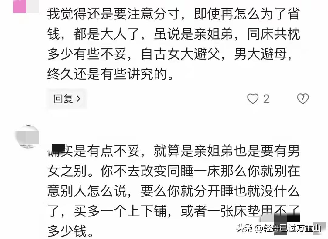 深圳一间6的出租屋,姐弟俩挤一张床1.5米的床。春夏秋弟弟打地铺,冬天太冷两人挤一张床,网上视频传开,立马有人说三道四,有人说“不懂避嫌”。 谁知道她14岁父母离异,爸爸妈妈都重组家庭,他们姐弟三人成了拖油瓶,出生河南的她为了赚钱,为了活下去,才是初中生的年龄,就独自扛起照顾家照顾弟弟妹妹的职责,去深圳打工。 就这样的一个小女孩,竟然供弟弟上完大学,她眼中每一分钱都得精打细算,避嫌就得换房,深圳的房价要是她租两室一厅,她赚的钱还不足以支撑房租。 姐姐现在29岁,弟弟22岁,姐姐月入五千,光是房租就占了两千多。弟弟刚毕业,工作还没着落,找了一份工作,在实习期工资四千多。两人合租,省下的钱用来生活,给弟弟交社保、买通勤卡、改简历。 姐姐的想法很直接:还想攒钱给弟弟娶媳妇,在河南老家,男孩子没房很难娶媳妇我们没有父母可以依靠,只能比别人多努力…… 有人问?都成年人了,姐弟一张床,睡觉不觉得得尴尬吗?还有人提出不会买一张上下床吗?首先两人不是长期睡一张床,春天夏天秋天弟弟都是打地铺睡,只有冬天天气冷了怕弟弟感冒,两人才睡一张床,冬天两人穿衣得体,床上有明确的界限,两床被子,连晾晒的衣服都分出界限。 对于洗澡不方便,两人就轮流换洗,一个要洗澡换衣,另一个就出门散步,等待另一个洗完再回去。姐姐眼中,弟弟永远都是一个孩子 她说:“弟弟永远是那个不会嫌弃我做饭多难吃都会吃完的人,希望以后你娶了媳妇不要忘记姐姐。” 至于网友提到的买高低床就更不现实了,房子是房东的,又不是姐弟俩的,哪能说买就买,买了房东原来的床摆什么地方?等不租房了是不是还得还房东一张新床,对于穷人来说,哪有那么多讲究,大家多些包容,他们只是分享了自己的不容易,没有卖惨也没有伸手要钱,他们只是太穷了别无选择。 而且这个姐姐为了弟弟妹妹牺牲就大了,她长的挺漂亮的,按理说29岁应该成家了,她的确结过婚,但是因为要照顾弟弟妹妹,在丈夫眼中她弟弟妹妹永远是一个无底洞,于是离婚了。她没有父母帮忖,没有依靠没有背景,什么都没有,就靠自己单薄的身子扛起弟弟妹妹的生活重担,她应该被包容被理解被关心,而不应该被指责。