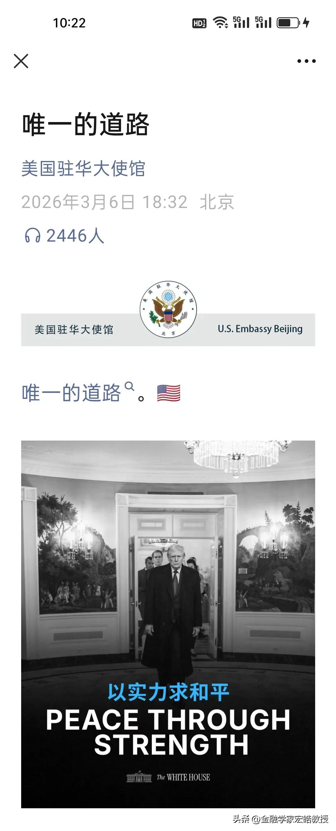 反差太大!看下图,美国驻华大使馆:从“没钱停更”到“唯一道路”,变脸比翻书还快? 去年10月,美国驻华大使馆还在哭穷,因为政府停摆,就说“没钱了,停更”,连社交媒体都运营不起。现在却疯狂刷屏,昨天更是甩出五个字“唯一的道路”以及一张配图“以实力求和平”,把霸权嘴脸摆得明明白白。网友看得集体刷屏“呵呵”。 从“没钱罢工”到“高调炫霸”,反差之大,让人咋舌。这背后,不过是美国政府换了人,外交话术也跟着换了皮。所谓“以实力求和平”,不过是用拳头说话的老套路。 当一个国家连大使馆的运营都要靠拨款博弈,所谓的“实力”,恐怕也只剩嘴硬了。
