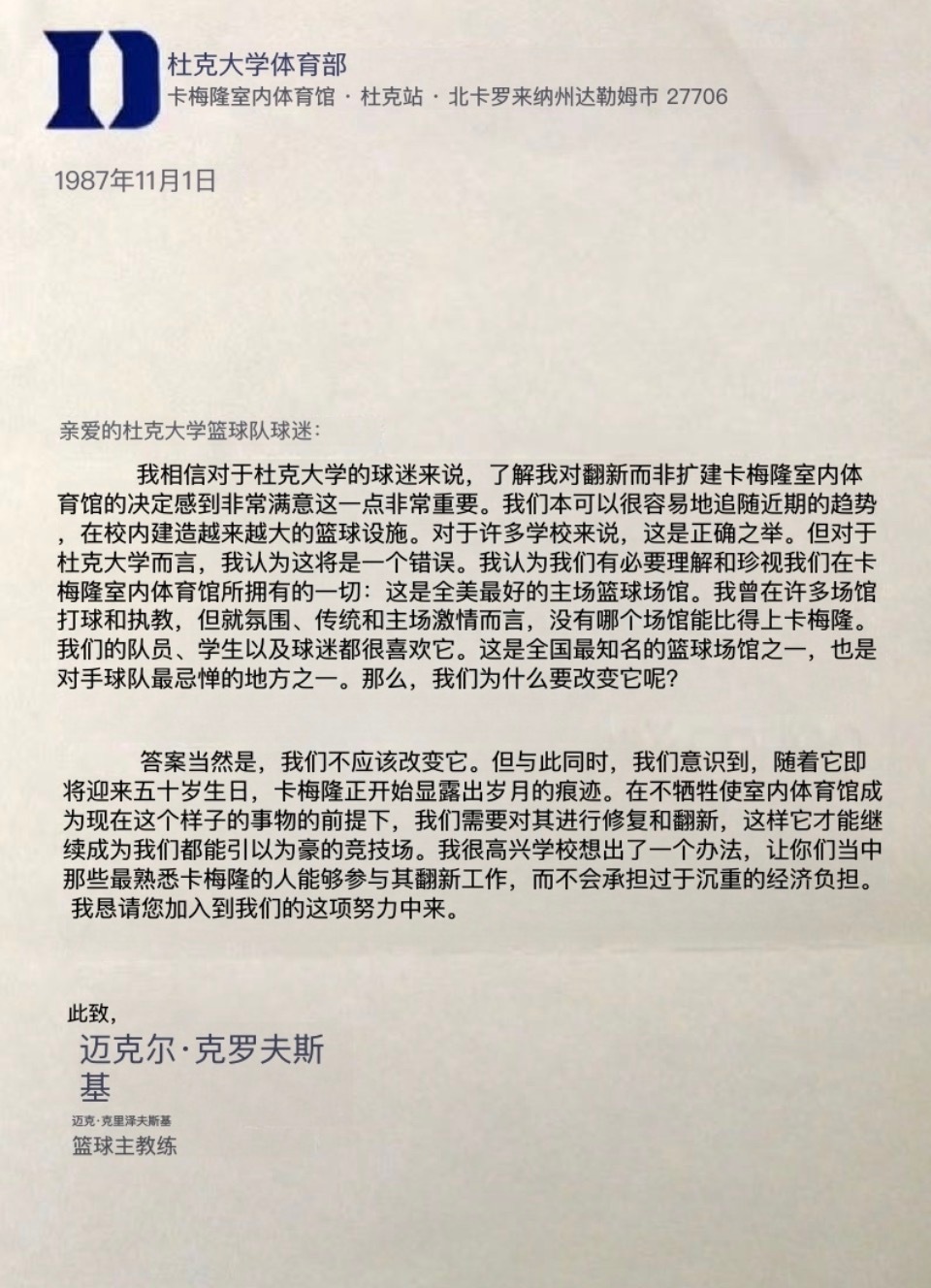 杜克男篮 老K教练的一封信