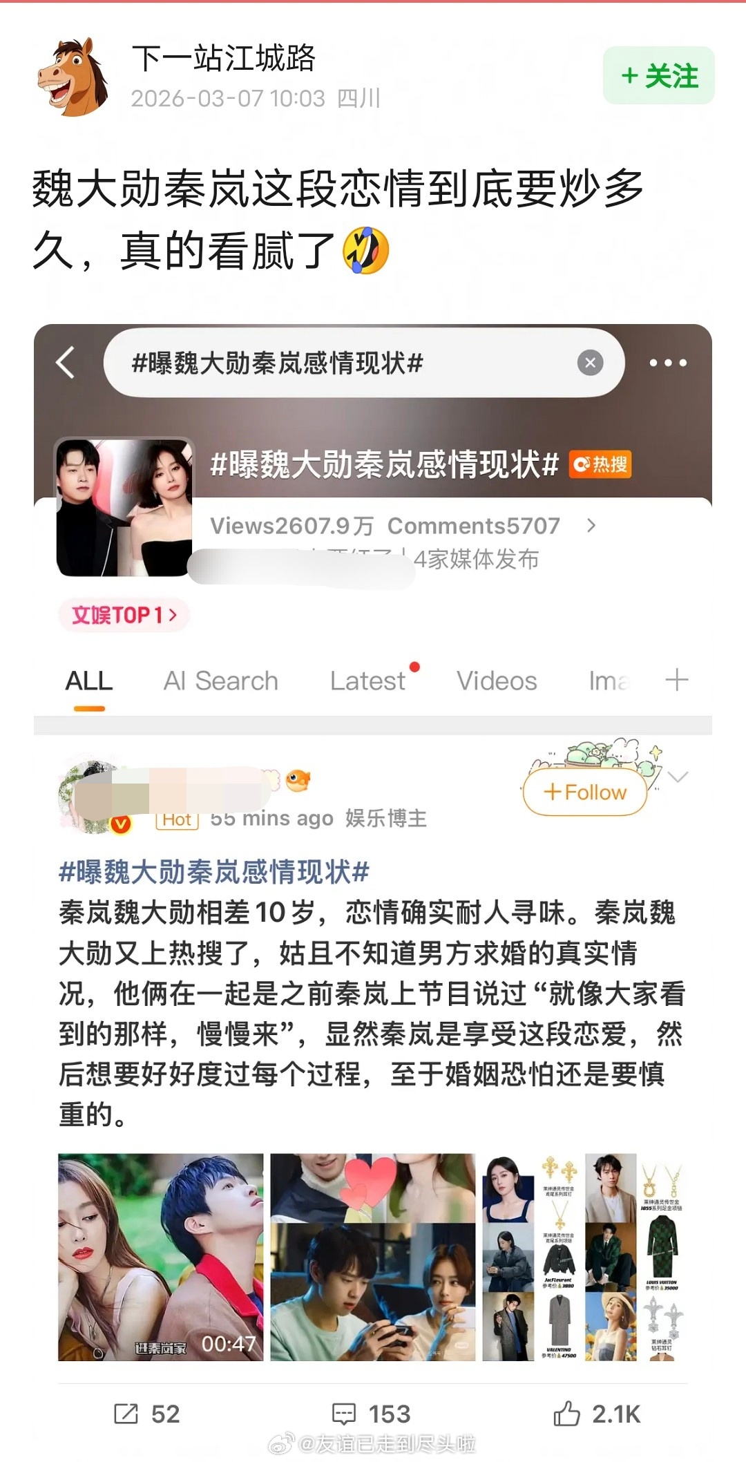 前脚秦岚《闪耀如她》下证,后脚双人热搜登顶网友问魏大勋秦岚这段恋情到底要炒多久?