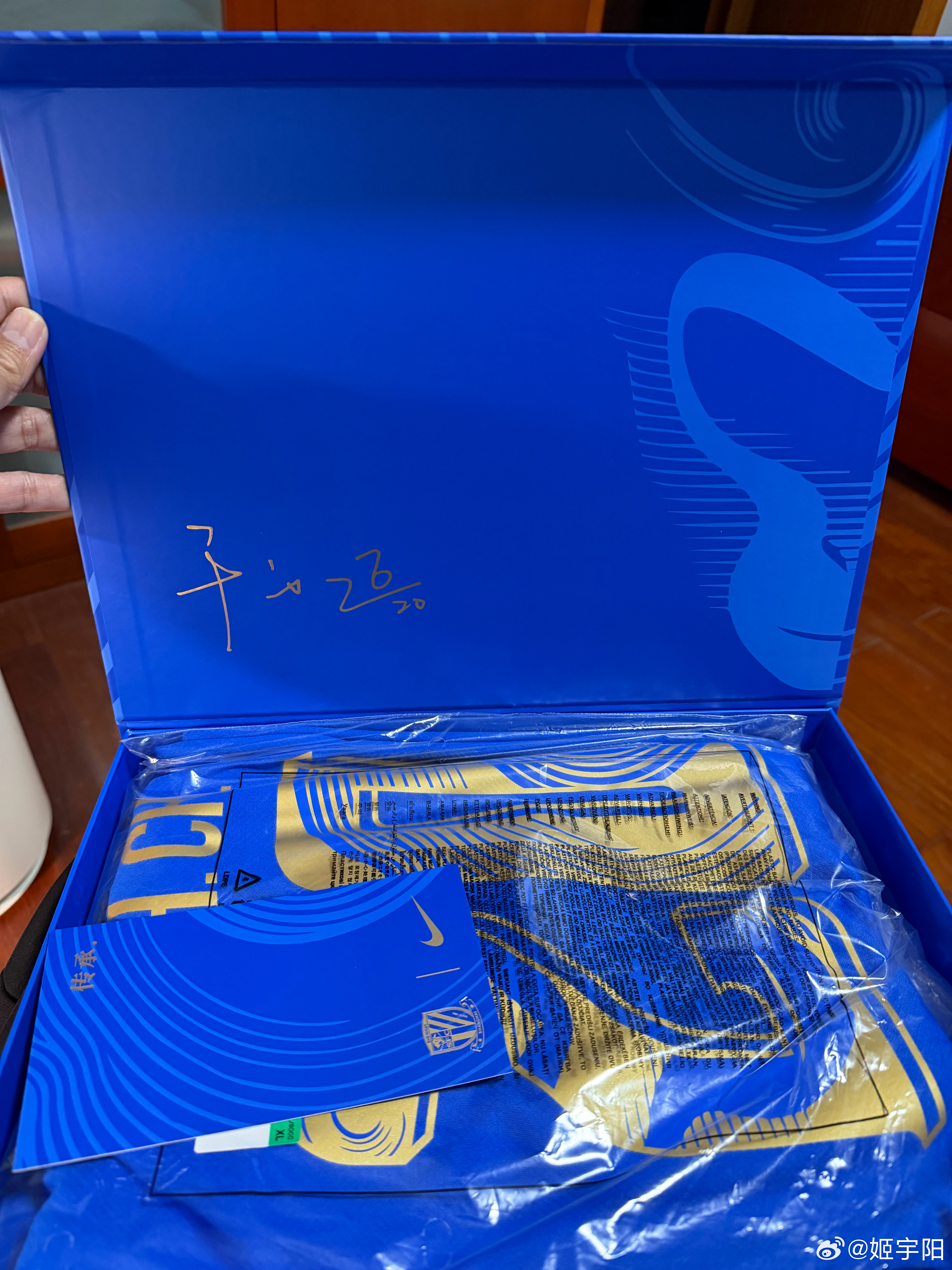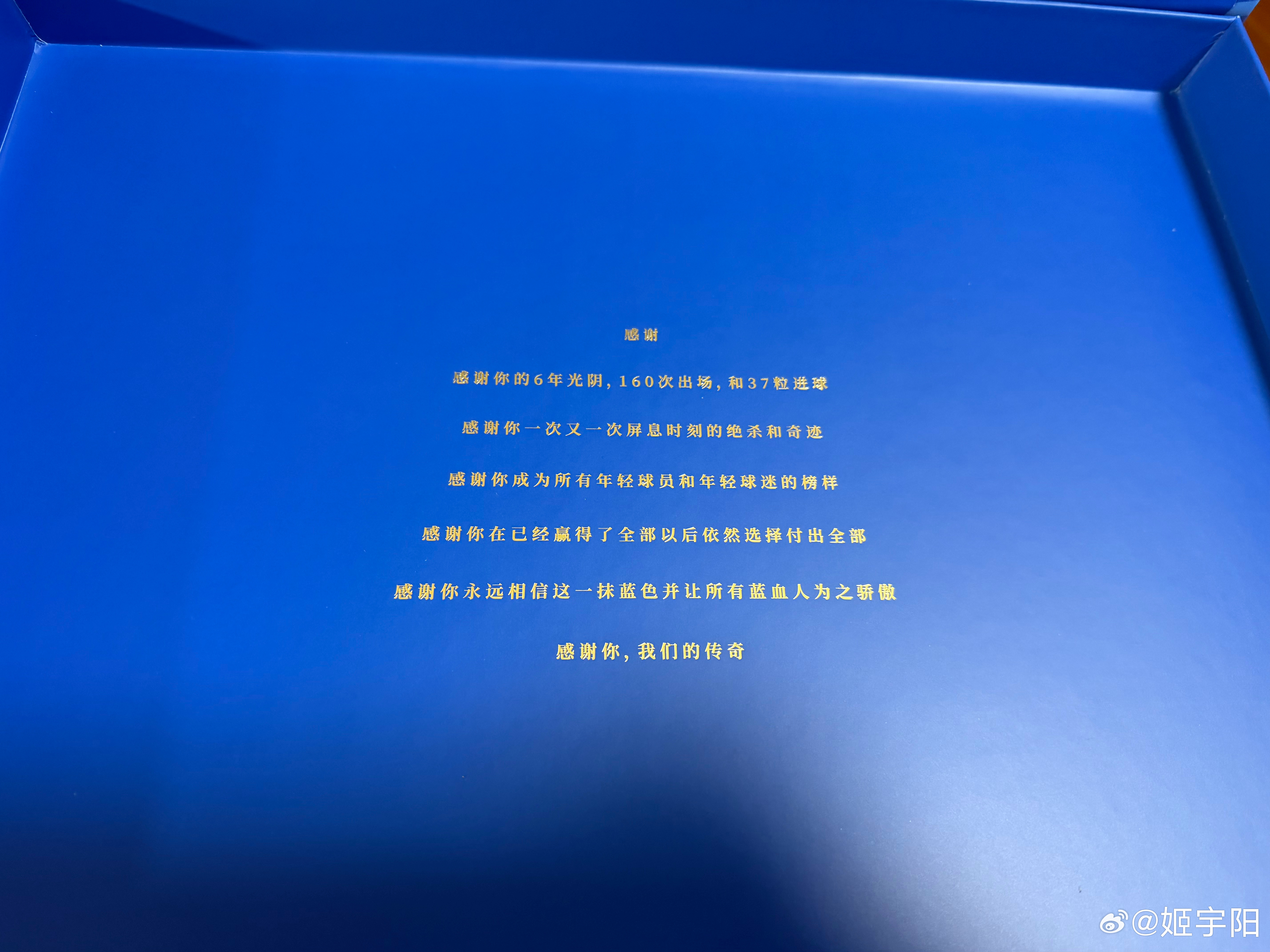 在特制专属包装盒和球衣背面,分别用金色的中英文印着这样一段话:感谢你的6年光阴,160次出场,和37粒进球 感谢你一次又一次屏息时刻的绝杀和奇迹 感谢你成为所有年轻球员和年轻球迷的榜样 感谢你在已经赢得了全部以后依然选择付出全部 感谢你永远相信这一抹蓝色并让所有蓝血人为之骄傲感谢你,我们的传奇上海申花上海申花vs大连英博