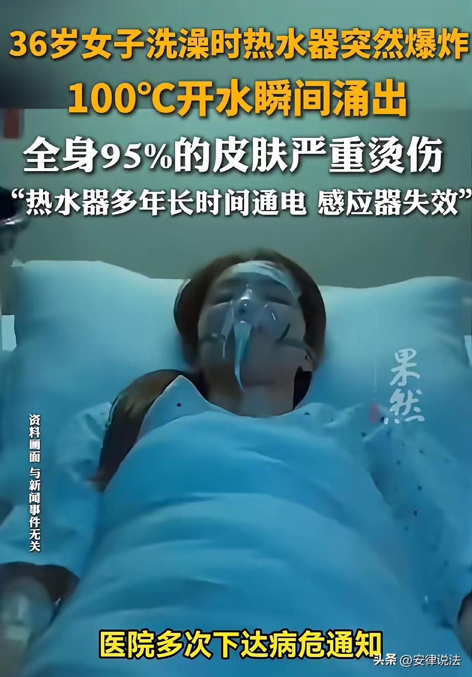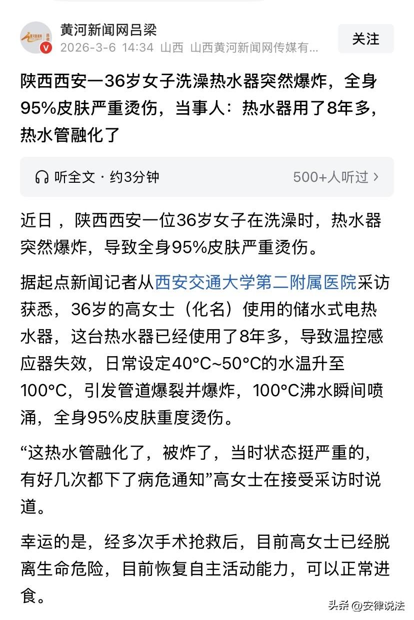 “值得警示!”陕西西安,36岁女子一丝不挂在家舒舒服服洗澡时,万万没想到,用了8年多的热水器,温控感应器突然失效,水温瞬间升至100℃,导致管道爆炸。女子只听到“砰”的一声,来不及反应,便被沸水浇遍全身,医生诊断女子全身95%的皮肤重度烫伤,好几次都给女子下了病危通知书,万幸的是,经过几次手术,女子最终脱离了生命危险。 据悉,前不久的一天晚上,36岁的高女士像往常一样,将热水器的温度调至40多度,准备舒舒服服洗个热水澡放松一下再睡觉。 怎料,就在其一丝不挂地洗澡时,热水器突然 “砰” 的一声炸了。 高女士当时根本来不及反应,瞬间被 100℃的沸水浇灌全身。 而等高女士等反应过来,就只感觉到全身剧痛。 高女士的家人闻声,赶到,看到高女士的惨状,当即将高女士送往医院。 医院诊断高女士全身95%的皮肤重度烫伤,期间几次都给高女士下了病危通知书。 好在高女士命硬,经过几次手术,最终才闯过了鬼门关,脱离了生命危险! 据悉,目前高女士已经恢复了自主活动能力、也可以正常吃饭了。 那为什么高女士家的热水器会突然爆炸呢? 原来,高女士家的热水器已经用了8年之久,事发时,温控感应器失效,导致温度瞬间上升,才导致管道爆炸。 对此,网友纷纷表态,有人说,才用了8年就爆炸,肯定是杂牌子! 有网友说,不管是电热水器是新的还是旧的,插着电洗澡就是在找死,洗澡前一定要拔掉电源! 还有网友表示,电热水器在设计上都应该设置最高温度,超过之后就应该自动断电,这是设计缺陷留下的安全隐患,高女士可以要求厂家赔偿。 那从法律上该如何看待此事呢? 首先,我们要知道,家电不是 “用到坏为止”,是有安全寿命的!一旦超过安全使用年限,继续用,风险会指数级上升。别心疼,该换一定要换。 应当注意的是,我们通常说的质保期并不等同于安全使用年限,质保是厂家免费维修的期限;而安全使用年限是指家电在正常使用条件下的建议使用期限。 根据中国家用电器协会2020年发布的《家用电器安全使用年限》系列标准及2026年新国标,像洗衣机、吸油烟机、燃气灶、储水式电热水器等家电的安全使用年限是8年,空调、电视机的是8-10年,电冰箱、微波炉、电风扇的是10年,而电饭锅、电压力锅的只有5年。 还应当注意的是,《民法典》第1202条规定:“因产品存在缺陷造成他人损害的,生产者应当承担侵权责任。” 第1203条规定:“因产品存在缺陷造成他人损害的,被侵权人可以向产品的生产者请求赔偿,也可以向产品的销售者请求赔偿。产品缺陷由生产者造成的,销售者赔偿后,有权向生产者追偿。因销售者的过错使产品存在缺陷的,生产者赔偿后,有权向销售者追偿。” 《产品质量法》第45条规定:因产品存在缺陷造成损害要求赔偿的请求权,在造成损害的缺陷产品交付最初消费者满十年丧失;但是,尚未超过明示的安全使用期的除外。 也就是说,产品责任是无过错责任(即无论是否尽到注意义务,均需赔偿)。即使产品本身质保期已过,若能证明伤亡是因产品在设计、制造或警示说明中存在缺陷,生产者仍需赔偿。 但是如果像高女子这样,明知道热水器已经过了明示的安全使用期,仍然不管不顾地继续使用,出现问题,一般就只能认栽,无法再向生产商索赔。 最后,一次日常洗澡,一台超期老家电,一场差点要命的意外,高女士的案件令人唏嘘! 也再次提醒广大朋友们,家电一旦超过安全使用年限,不管是好还是坏,一定不要再犹豫,及时更换! 这事您怎么看?欢迎在评论区留言,与大家一起交流您的看法! ------ 关注@安律说法 案例中看人生百态,法律中寻破局之法!