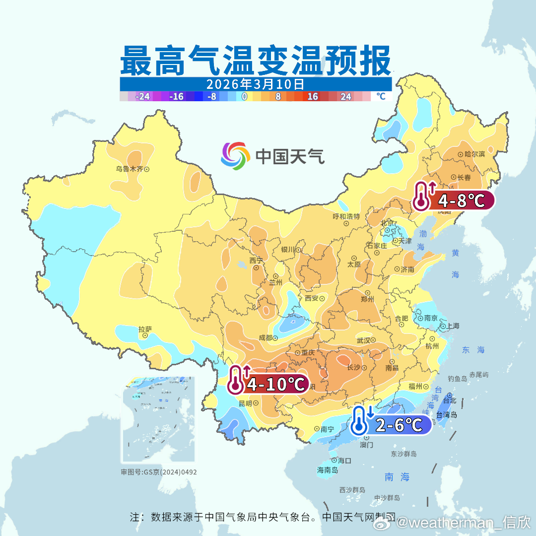 后天冷空气继续东移南下,东北华北因为大多晴天,有光照加热,抵消了冷平流降温,因此东北华北的降温并不明显。而在冷空气过后,青海甘肃内蒙古一带,将明显升温。随着冷空气推动降水南压,西南到江南多地,后天也将有降温。10日冷空气继续南下,华南降温,但我国其他大部地区升温。