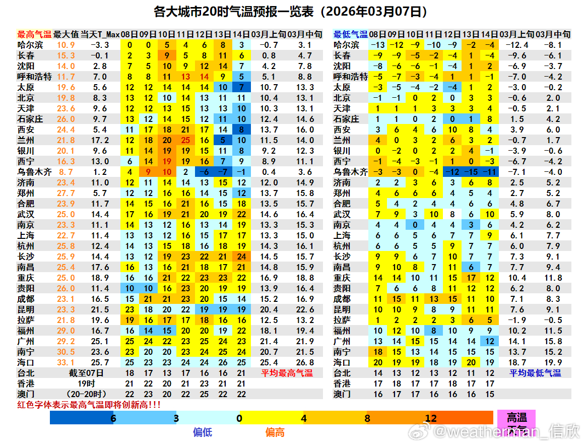 11日我国大部地区继续升温,将是近期20℃范围最广的一天,南方大部地区最高气温基本都将在20℃以上。但11日以后有冷空气影响西北,导致剧烈降温。乌鲁木齐10日最高10℃,可能创今年新高。12日最高降至零下6℃,2天降16℃。兰州11日最高可达25℃,13日降至5℃,2天降20℃。