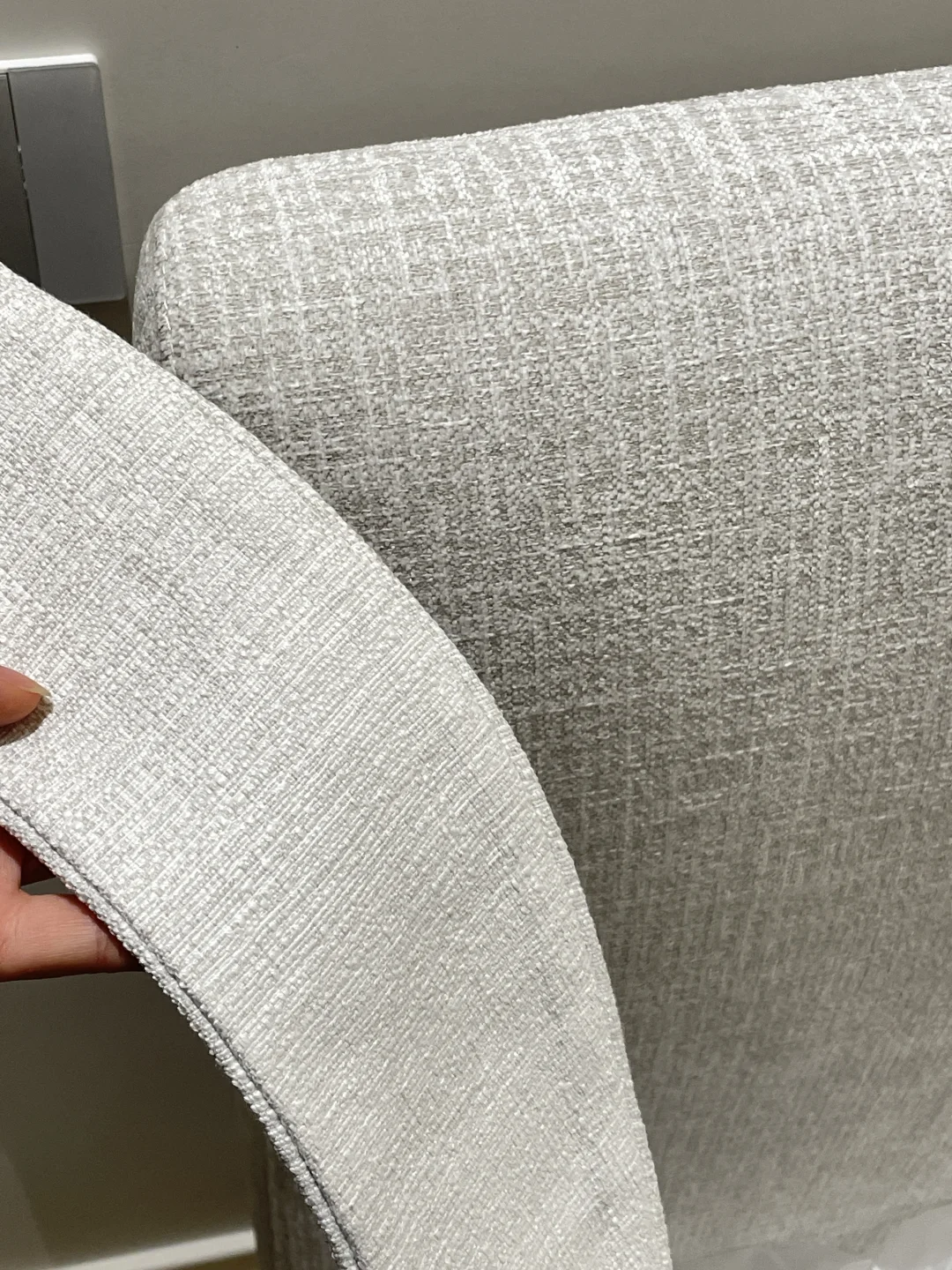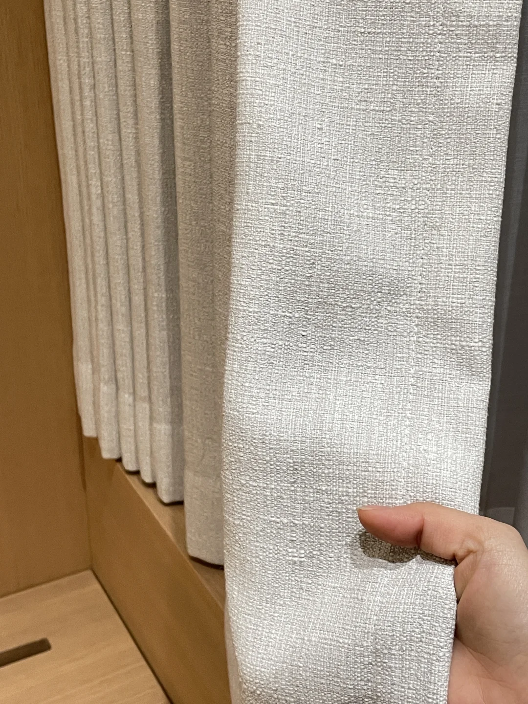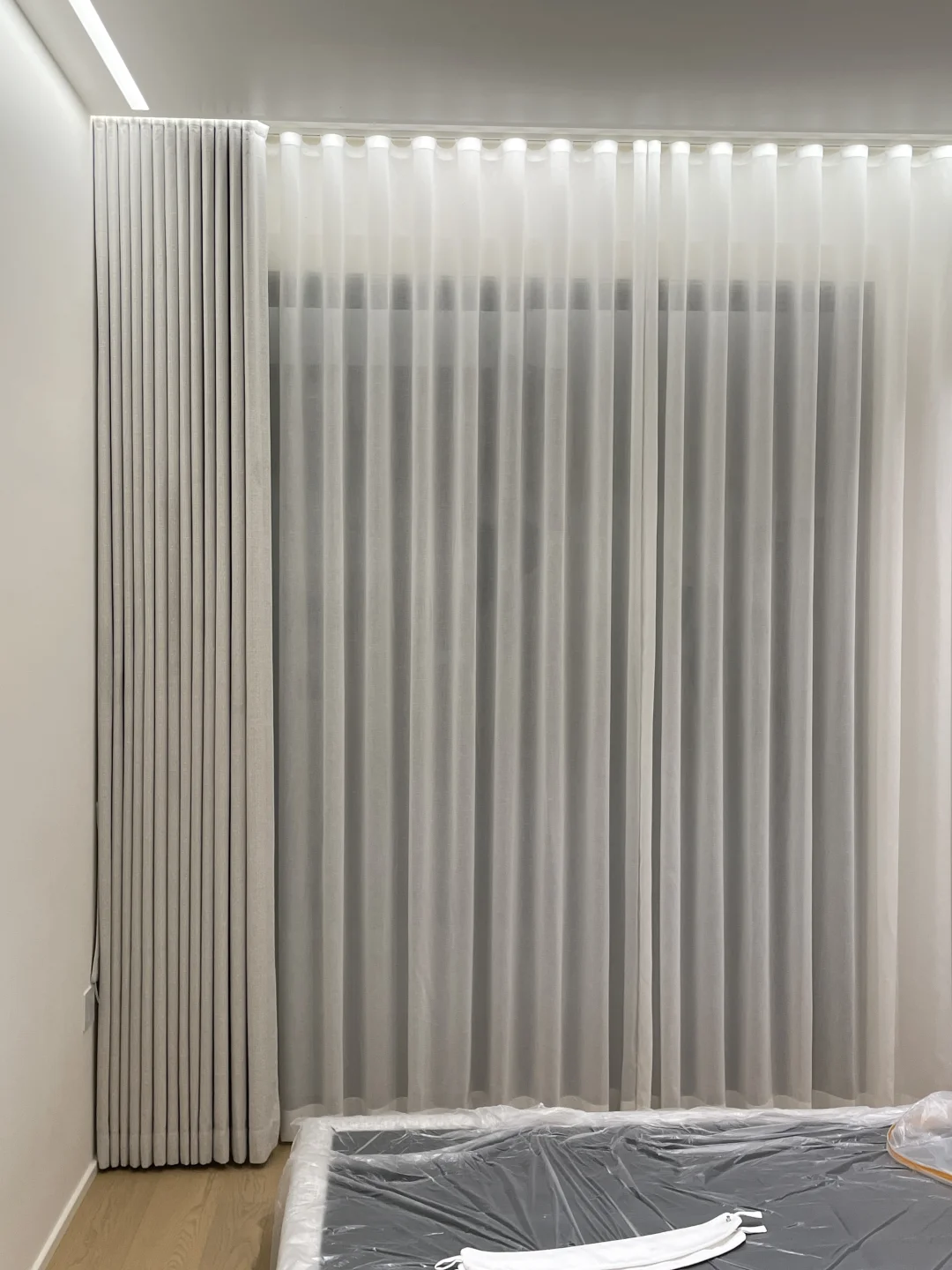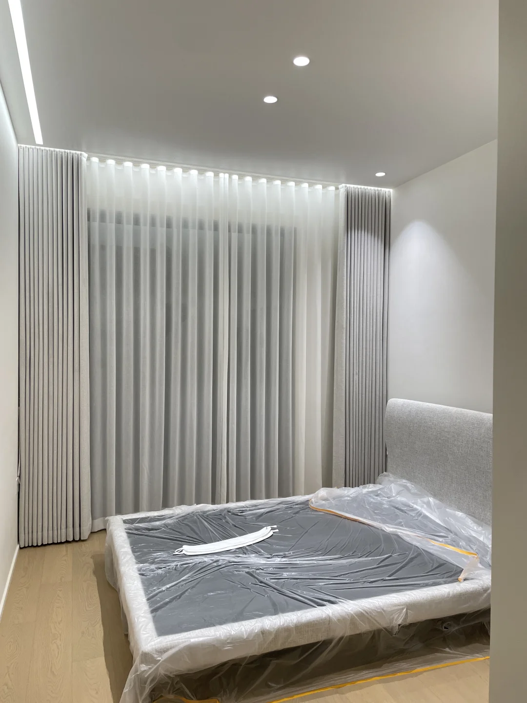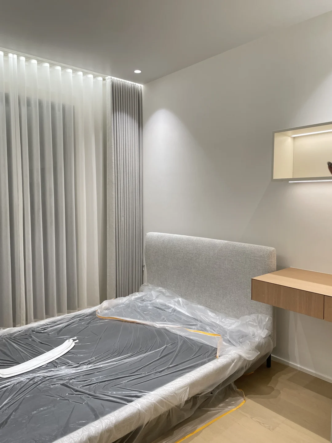 布艺窗帘的选择,原则上是去和空间里面的主体色或者背景色亦或者材料纹理上去寻找呼应,本案例的布艺窗帘是和床头面料颜色和纹理协调统一,空间视觉上比较一致,一种安静整洁的落地效果。