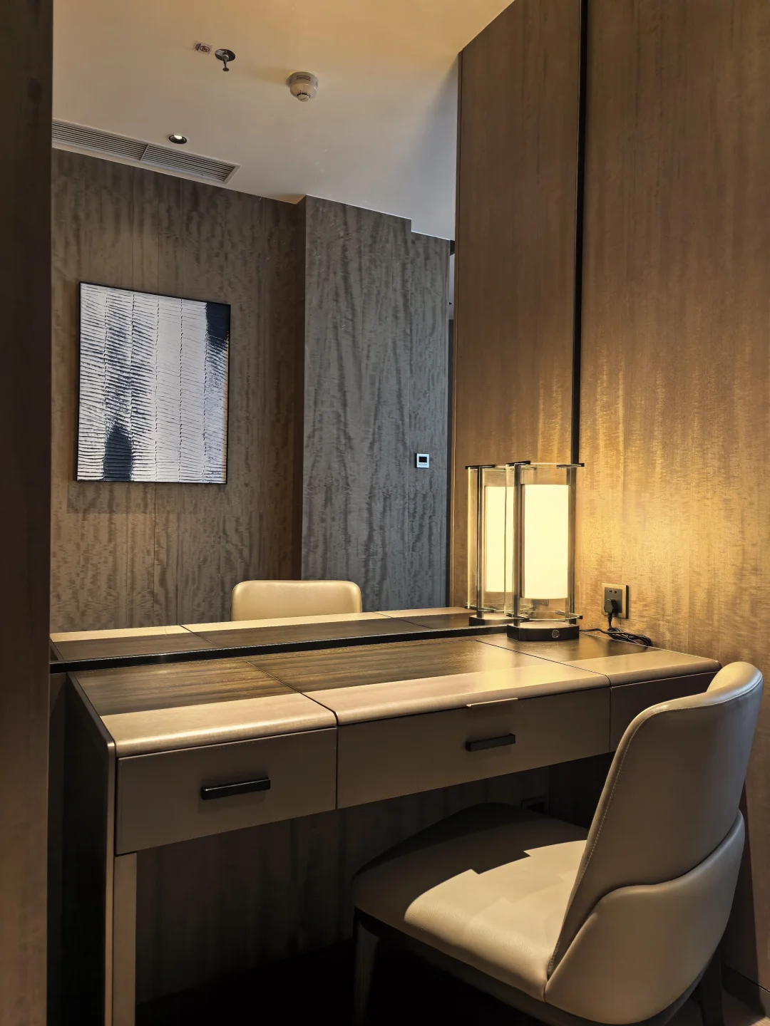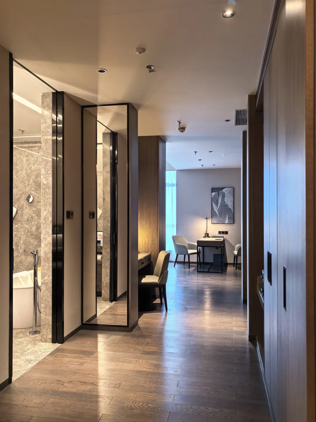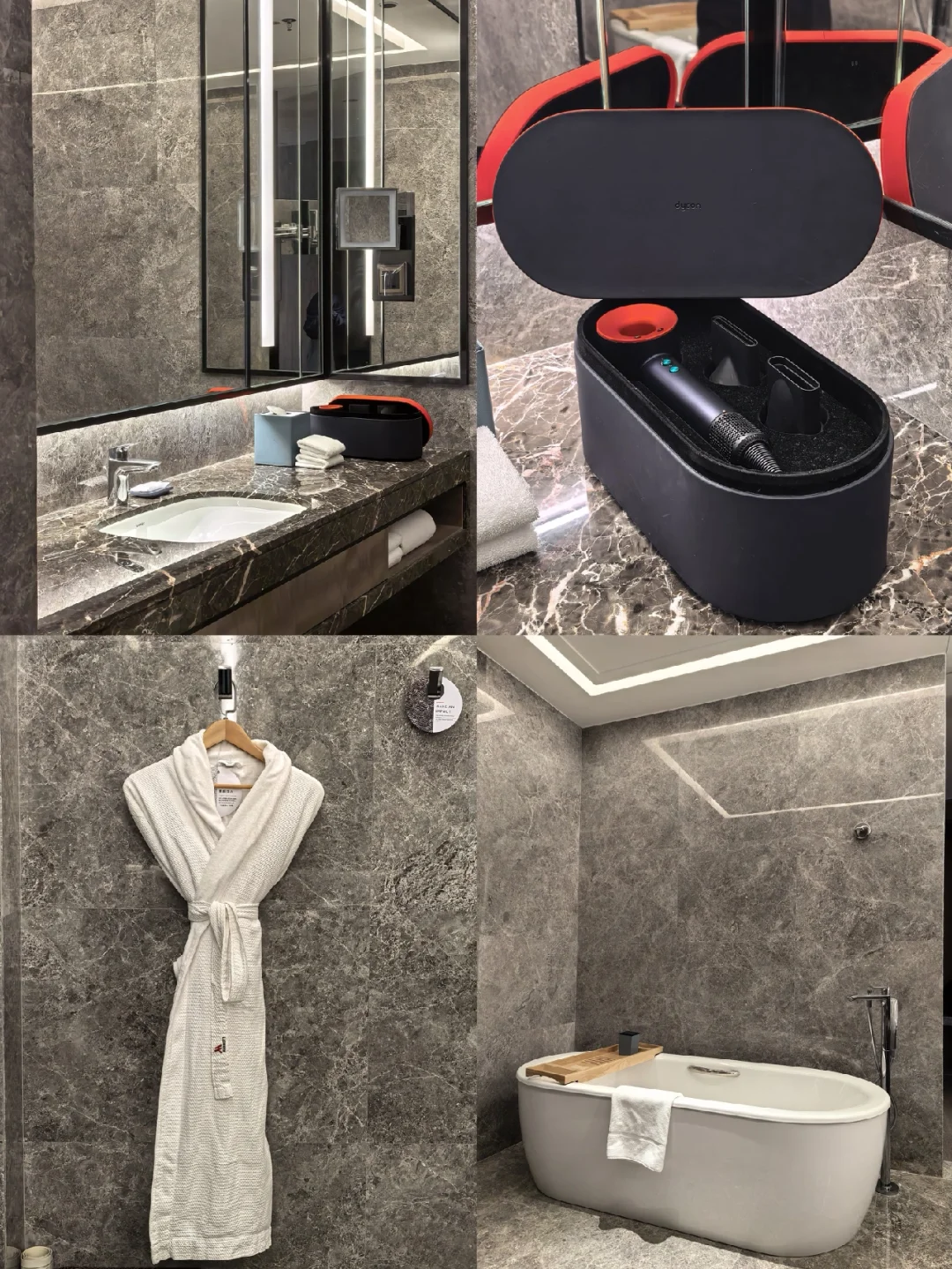 作为钛金会员,这次给到的是一间73㎡湖景大床转角隅景套房。房间面积不小,但格局稍微有点不一样。客厅、卧室之外,还有一块接近瑜伽室大小的空间。如果放一张瑜伽垫或者运动设备,其实会合理些。浴室配备了戴森吹风机,细节体验加分。