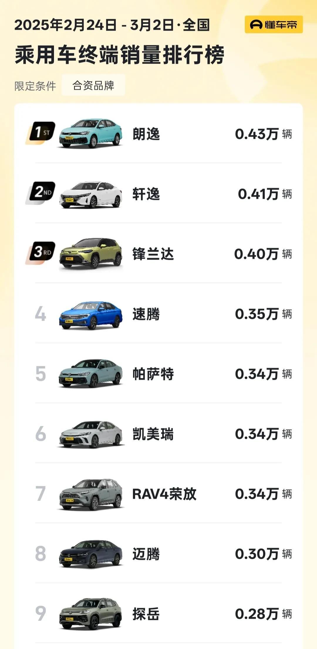 最近汽车圈子都在谈论一个话题:德系车是不是要“统治”合资车市场了?看看2025年3月第一周的销量榜,德系车在前十里占了六个席位,朗逸更是直接拿下销量冠军。这不禁让人想起前几年日系车“霸榜”的盛况,不禁让人感叹:风水轮流转,今年到德系家!但日系车真的不行了吗?这其中到底发生了什么?别急,咱们今天就来好好聊聊这个话题。