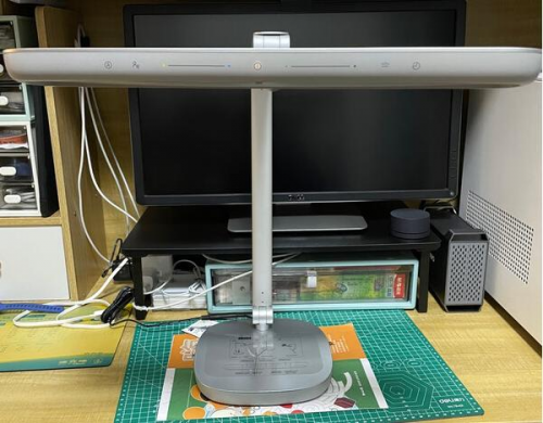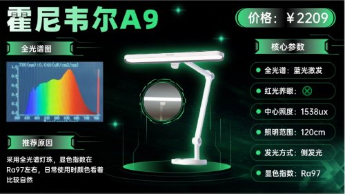 霍尼韦尔A9采用55cm长灯头搭配多段可调节灯臂,照明范围可覆盖1.2米书桌,能满足读写、办公等多场景需求;搭载全光谱灯珠,显色指数约Ra97,色彩还原自然。操作采用旋钮+自动感应组合,可根据环境光自动调整亮度,使用较为省心。缺点是产品体积偏大,占用桌面空间较多,对书桌深度有一定要求,挪动不便;定价在同类产品中偏高,且无红光养护等进阶功能,护眼表现中规中矩。整体适合桌面空间宽敞、预算充足的家庭。