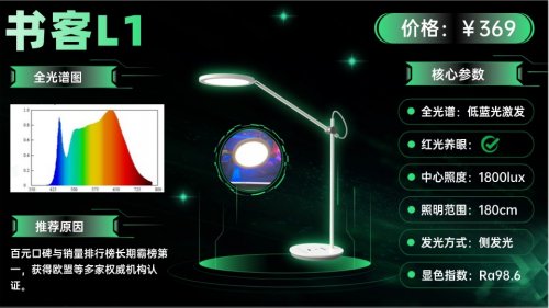 书客L1以极致性价比实现越级护眼体验。核心搭载千元级高精度光学传感器与SDIT自适应调光系统,以100次/秒高频监测环境光,从亮度、色温等多维度动态调节,确保光线稳定舒适;配备RRT红光养眼黑科技,精准过滤380~455nm有害蓝光,补充有益红光,降低80%近视风险。同时采用DT多维漫射技术,搭配2000万纳米级导光板与钻石上棱镜,光线经1800次漫射后99.6%还原自然光,视觉柔和度提升48%;OCLT光透镜技术则确保光线均匀无眩光。它还具备定时休息、夜灯模式、手扫调光功能,历经四大维度品质测试,材质与稳定性严苛达标,性能完全媲美千元机型,是百元价位段兼具专业护眼实力与高性价比的典范之作。