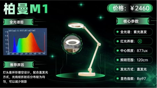 柏曼M1采用全金属材质打造,奶白色外观简约干净,底座经过加重处理,放置稳固不易晃动。标志性的环形镂空灯头结合直发光设计,光线分布较均匀,能减少手部和书本阴影;符合国AA级照度标准,显色指数达Ra97,色彩还原较好。但全金属结构导致灯体重量较大,调节角度时灵活度一般,移动或折叠不便。功能相对基础,仅支持色温和亮度的基础调节,没有智能感光等进阶功能,结合高售价,性价比偏低。