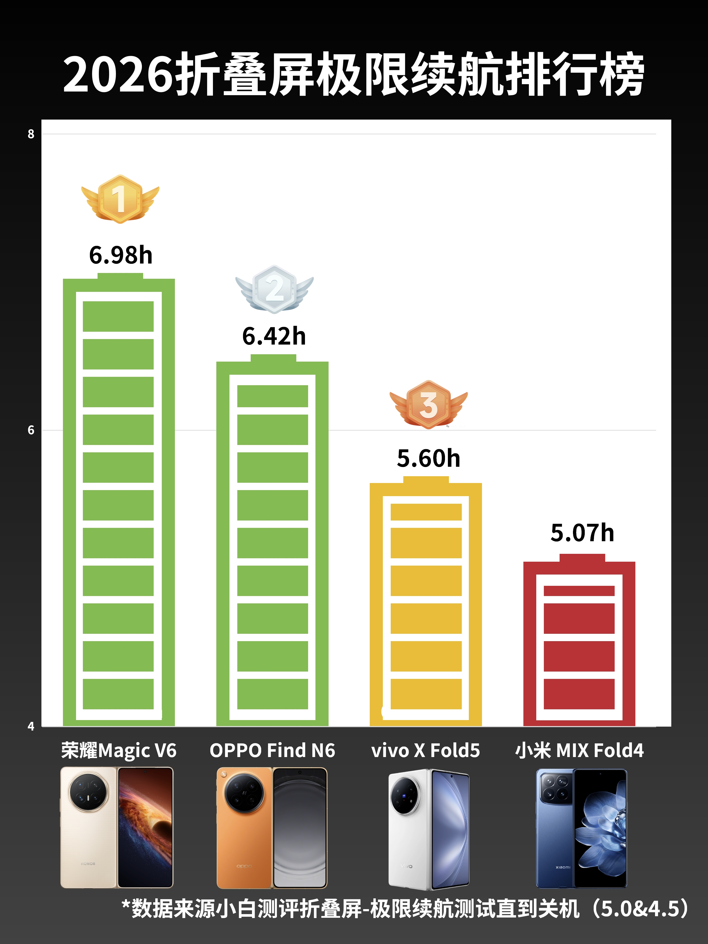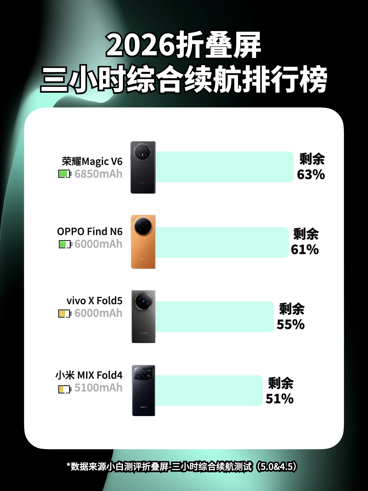 续航与性能:早出晚归也不怕没电OPPO Find N6配备了6000mAh冰川电池+第五代骁龙8至尊版,能效表现相比上一代提升不少,在小白测评的2026折叠屏续航榜单中,OPPO Find N6表现还是不错的,极限续航6.42h,位列第二,三小时综合测试后剩余61%电量,属于是比较轻松用一天的。