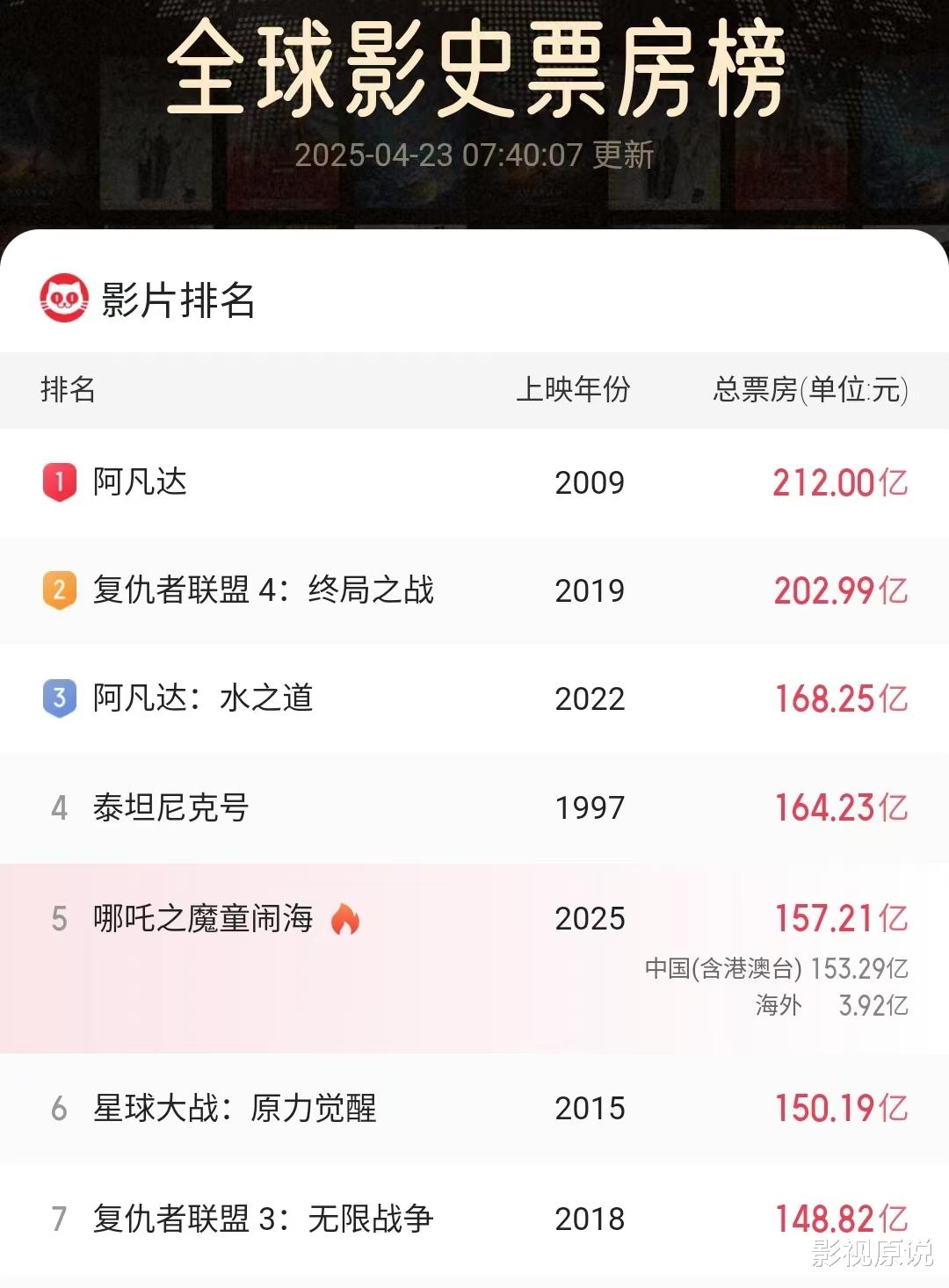 也正因此,《哪吒2》的内地以及全球累计票房成绩实现了大涨。据统计,截至目前《哪吒2》的内地累计票房是152.62亿人民币,全球总票房则已经达到了21.68亿美元,暂居全球票房榜第五名,和位列第四的《泰坦尼克号》之间只有不到1亿美元的差距,和全球第三《阿凡达2》的距离也只剩下1.54亿美元。