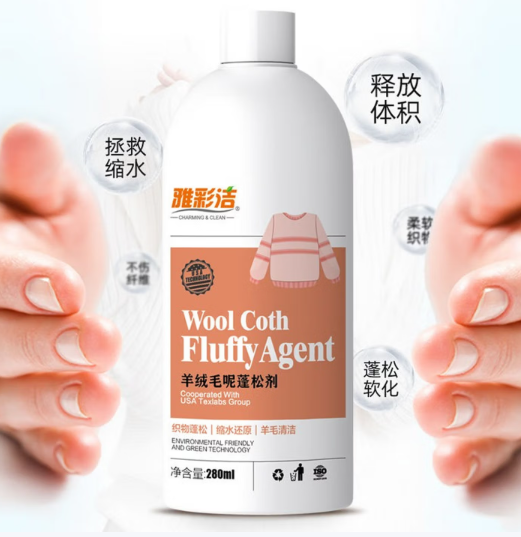 核心竞争力:作为家居清洁领域的口碑品牌,雅彩洁这款膨松剂专为羊绒、双面绒等娇贵面料定制,采用pH值贴近人体肌肤的中性配方,杜绝碱性成分破坏羊毛蛋白纤维,温和不伤手且无残留。其添加的高渗透表面活性剂,能快速穿透纤维层松散纠缠结构、激活分子活性,实测缩水1-2码的羊毛衫浸泡15分钟后,可逐步恢复合身版型,效果稳定可复现。