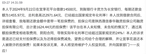 一名用户反映,其于2024年9月22日在宜享花平台借款14500元,到账银行卡资方为长安银行,每期还款金额为1455.97元,总利息高达2971.64元。在找到借款合同详细查看后,他发现每期还款金额中带一笔担保费,担保费总计是1624.44元,而其本人并不知情。