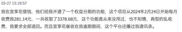 另外,在黑猫投诉上还有用户宣称,其被宜享花开通了权益分期的功能,“这个项目从2024年2月24日开始,每月收费我281.14元,一共收取了3378.68元。”但这名用户表示,这个功能他从来没用过,也不知情。