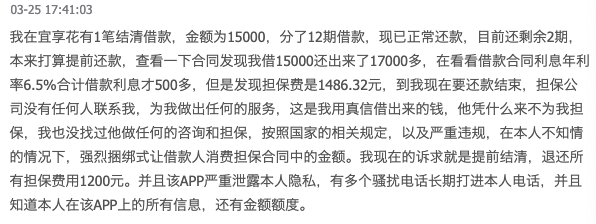 另一名用户也表示,他在查看合同时才发现比利息还高的担保费——“我在宜享花有1笔借款,金额为15000元,分了12期,正常还款,目前还剩余2期,本来打算提前还款,查看一下合同发现我借15000元还出来了17000多元,再看看借款合同,利息年利率6.5%,合计借款利息才500多元,但是担保费是1486.32元。”