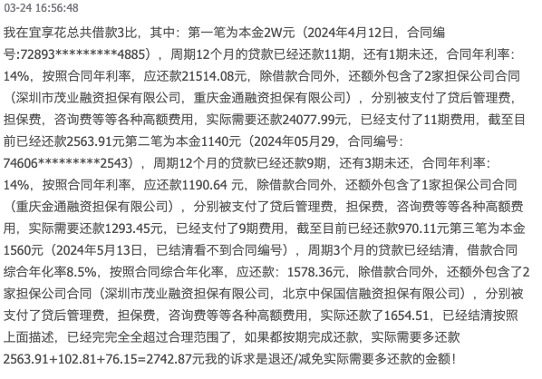 根据这名用户所宣称的金额,算上担保费,其承担的综合年化利率高达约42.41%。