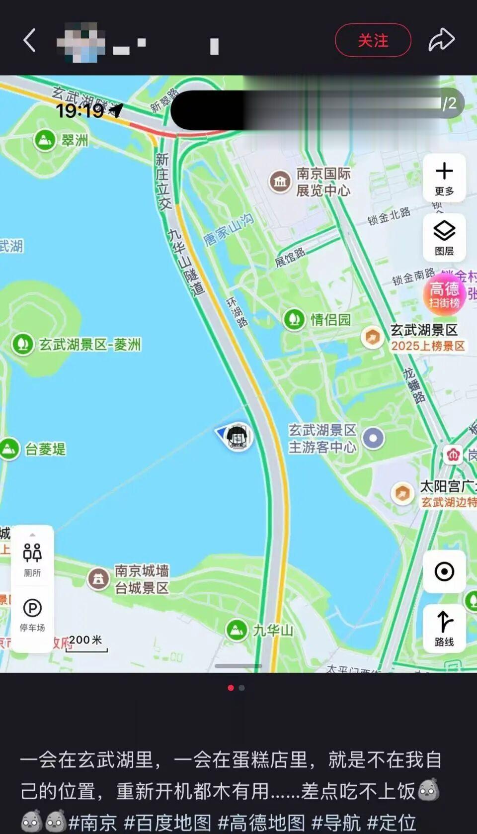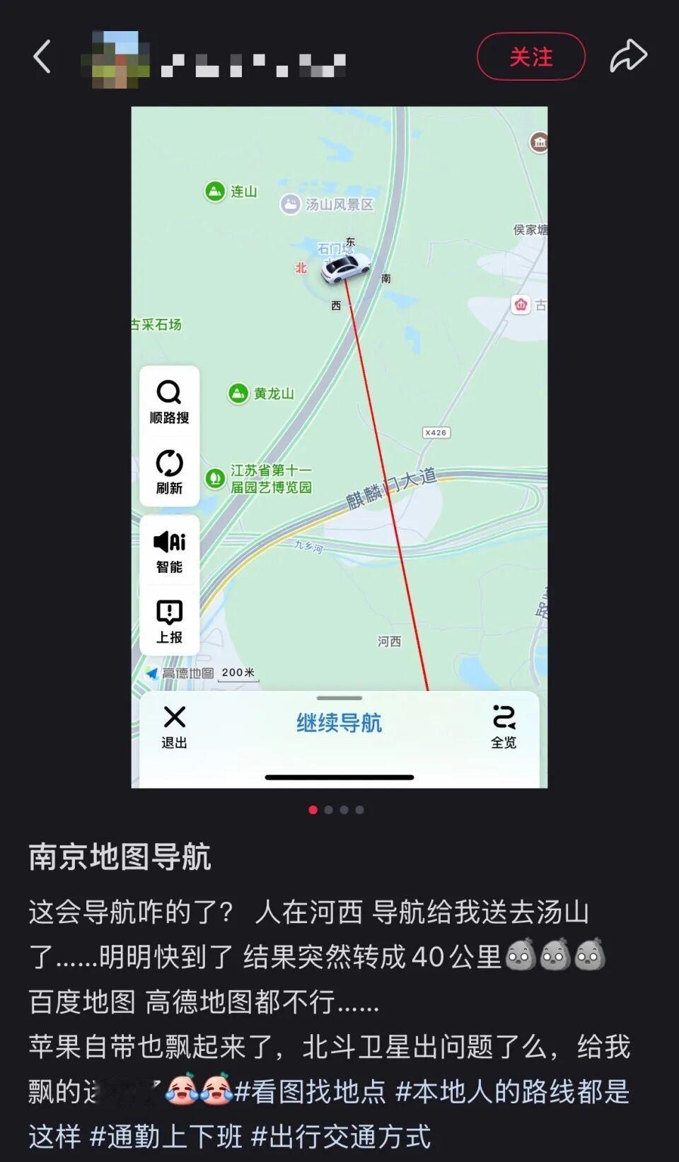 有网友反映,“导航崩溃了,一会儿显示在秦淮,一会儿显示在鼓楼。”也有网友表示,“人在河西,导航给我送去汤山了,明明快到了,结果突然转成40km,百度地图、高德地图都不行,苹果自带的也飘了起来。”另有网友反映,“人在江心洲家里,已经跑玄武湖里面去了。”