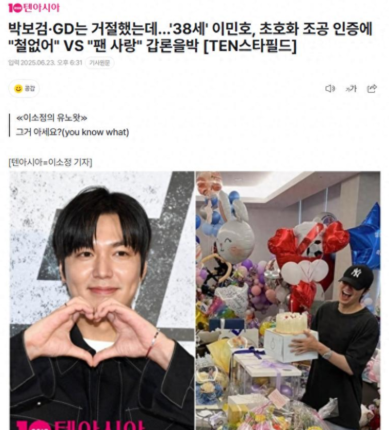 韩国人气男演员李敏镐因晒出粉丝赠送的豪华礼物引发争议,部分网友指责李敏镐作为近出道20年的资深演员不应该理所当然地接受粉丝“朝贡”。