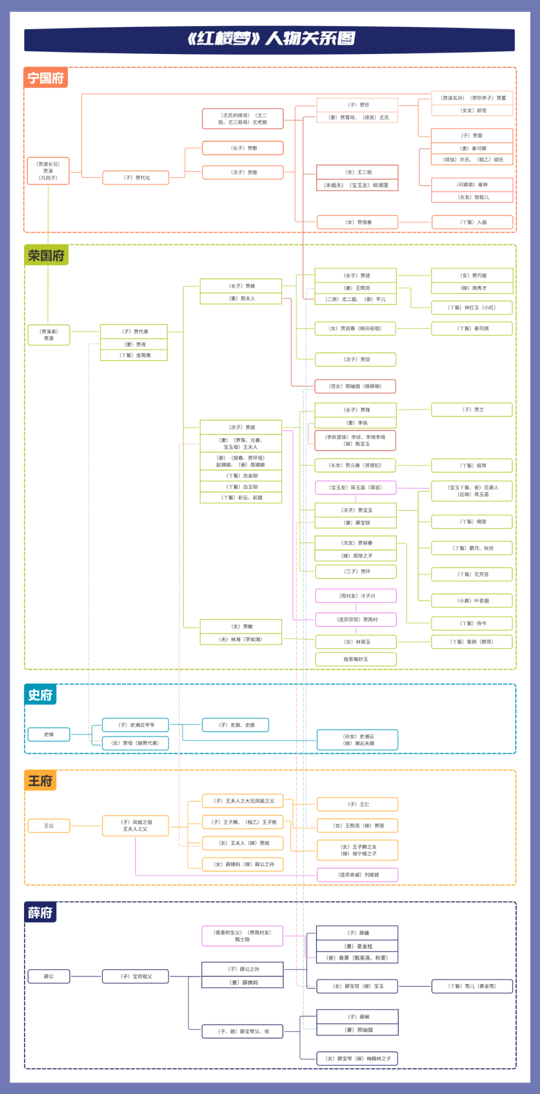 近年徐恭时统计得红楼梦人数:男495人,女480人,共计975人。其中有姓名称谓的732人,无姓名称谓的243人。曾几何时,因为出场人物太多,理不清人物关系,《红楼梦》被网友们笑称为”死都读不完“名著之一。这个时候如果有一张人物关系图,可以从整体上对错综复杂的家族人物进行梳理。