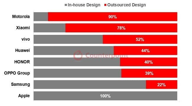 根据Counterpoint在2024年上半年的手机厂ODM占比统计(按出货量计算),除开全高端的苹果,和人称韩国“李家城”的三星,ODM占比最低的国产厂商是OPPO、荣耀和华为。