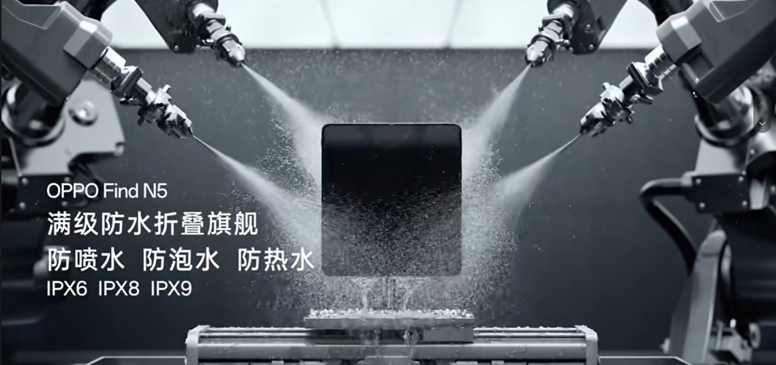 例如OPPO Find N3 Flip等折叠机型就通过了TÜV莱茵60万次折叠无忧认证(每天折100次,也能折16年),而大折叠Find N5则是首款通过IPX6、IPX8、IPX9满级防水认证↓的折叠产品。