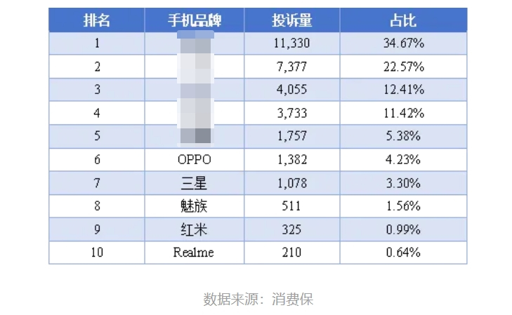 中国电子商会旗下的消费服务保障平台(消费保)↑ 统计了2021年到2025年Q1,手机类产品累计投诉量数据(数据过于big月旦,给前几名打个码)。