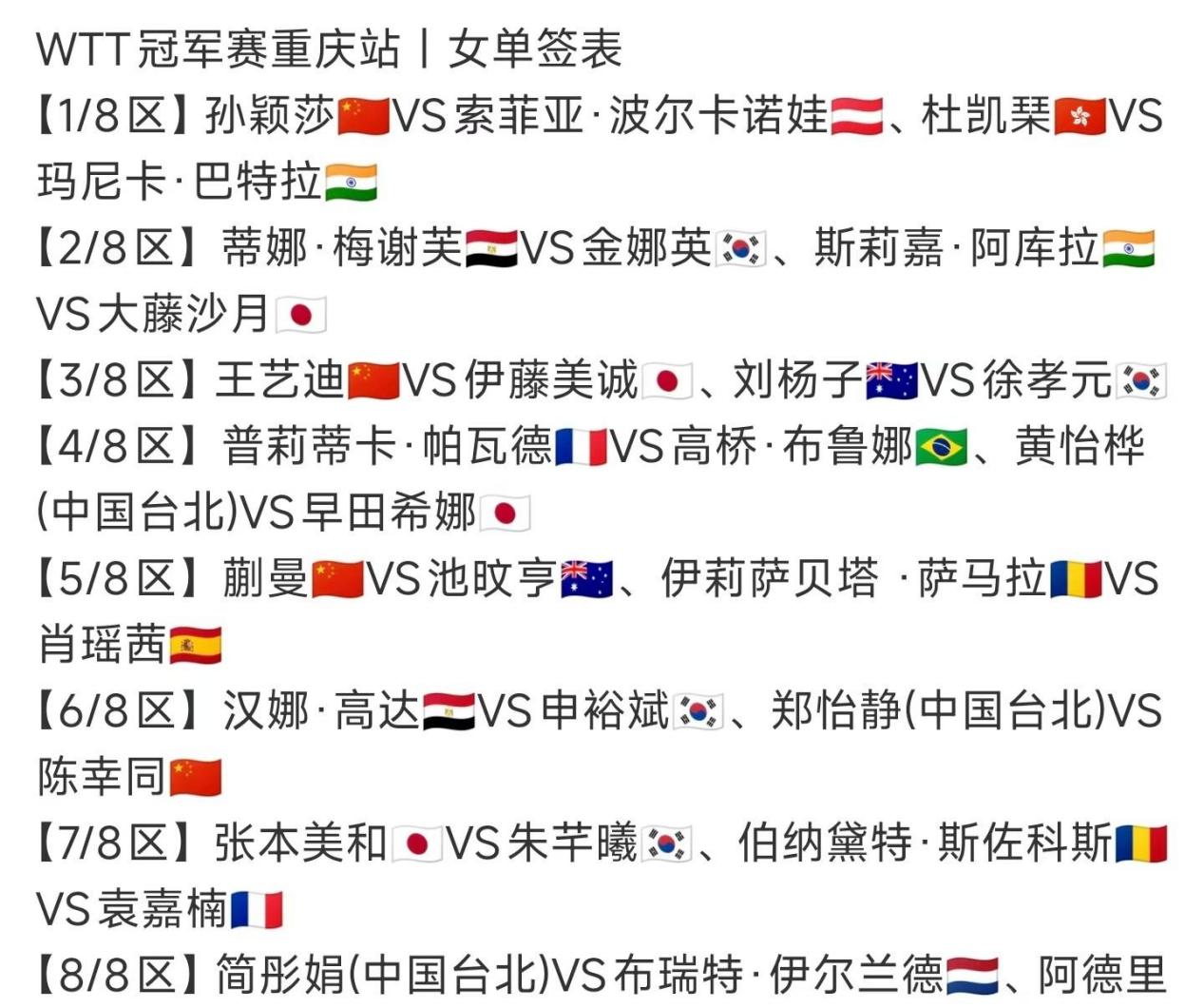 乒乓球比赛又要开始了,重庆站马上就要打响,五个中国女将要上场了。孙颖莎、王曼昱她们都遇到了不错的对手,谁能赢还真说不准。最近几个大赛打完,排名有点变化,孙颖莎还是第一名,领先挺多的。
