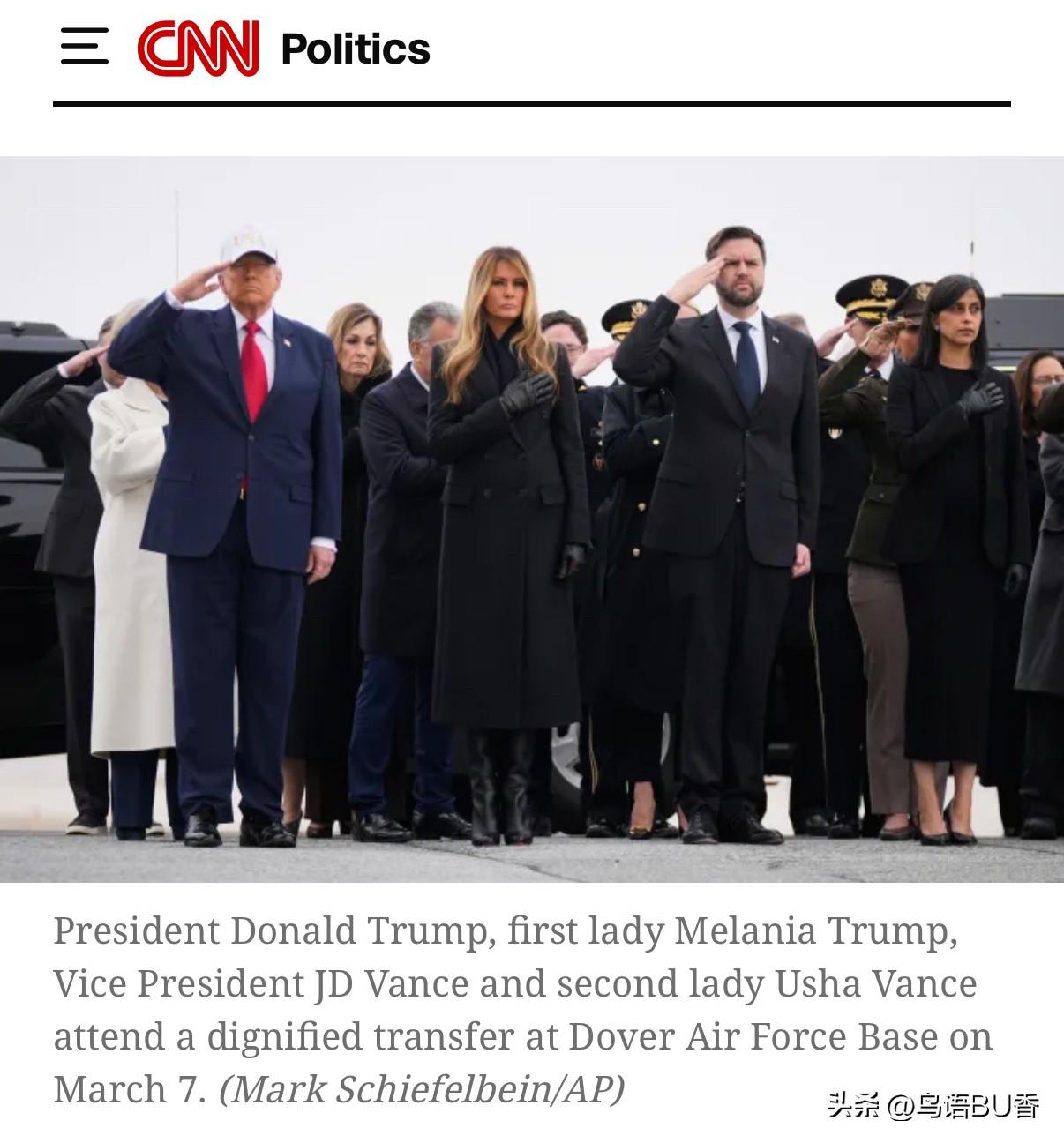 昨天(7号),六名美军遗体被运回美国基地,他们是在美军驻科威特基地被伊朗导弹所杀。 他们的家人和美国政要前往机场迎接这些士兵的遗体。川普总统和第一夫人(川普第二任期她很少露面),万斯副总统及美军高层将领(包括国防部长赫格塞斯,参谋长联席会议主席)均出现机场接机。 当装在着他们遗体的转移箱(临时棺木)从丹佛(Dover)空军基地停机坪对面的C-17运输机上搬运下来时,戴着一顶印有金色“美国”字母白色球帽的川普向他们举手致敬。 图 自CNN