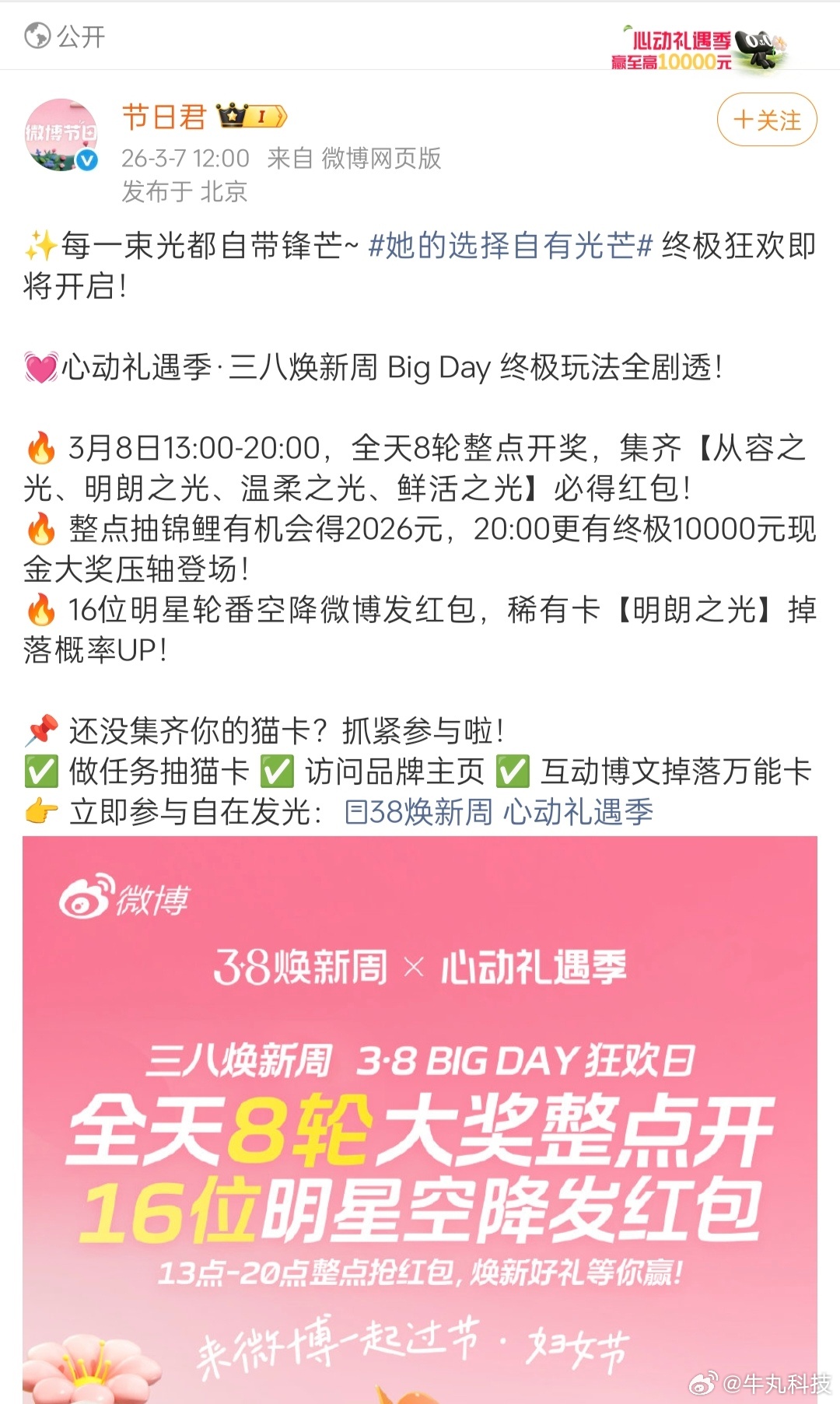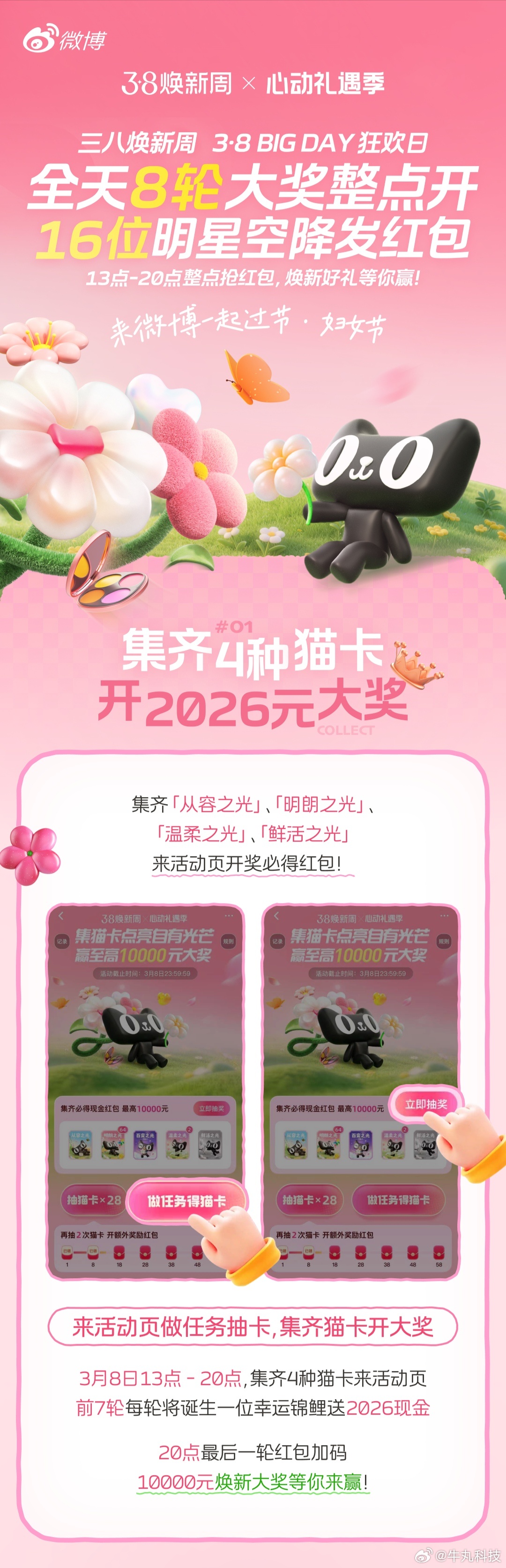 全微博开抢百变之光集合,同学们!快来参与天猫×微博集卡活动呀!今天女神节福利炸场,13:00-20:00全天8轮整点开奖,错过真的亏大!只要集齐“从容之光、明朗之光、温柔之光、鲜活之光”四张卡片,必得红包!网页链接