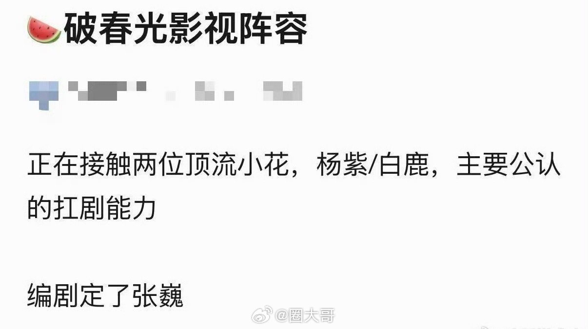 曝破春光接触杨紫白鹿哦哟,没想到杨紫和白鹿会同时看上一部ip啊,小说《破春光》影视化筹备中,据说剧组在接触白鹿和杨紫。女主会在两位美女中间二选一,不得不说,剧组对杨紫和白鹿的扛剧能力很是认可了!网传杨紫白鹿或演破春光
