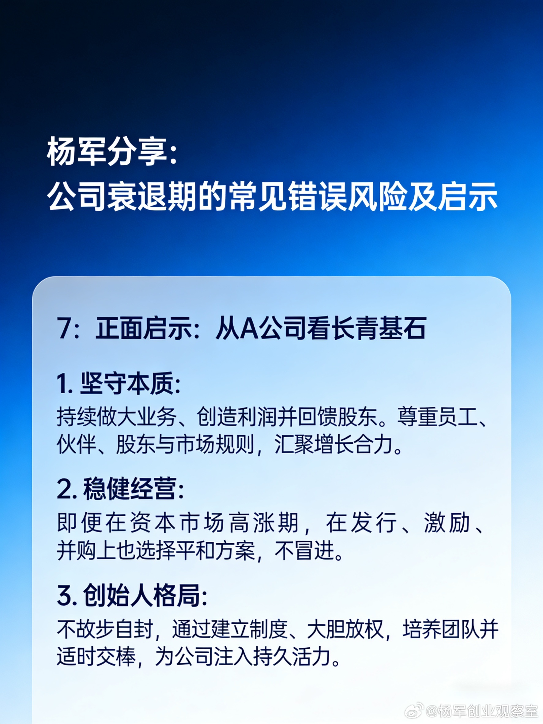 7️⃣ 正面启示:坚守本质、稳健经营、创始人格局,是穿越周期的长青基石。