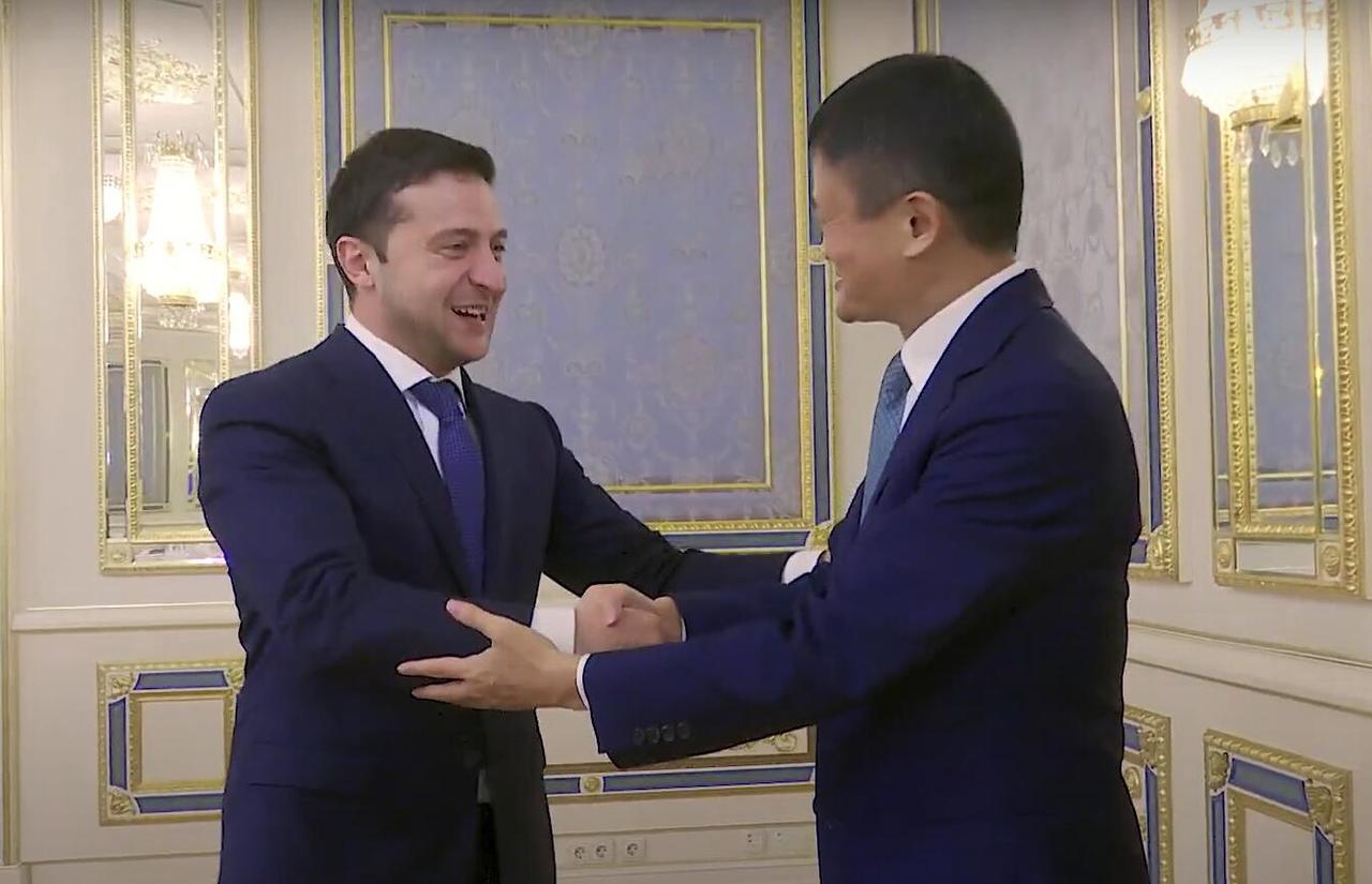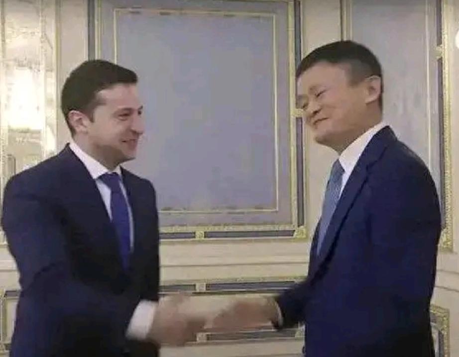 马云曾和泽连斯基见面并合影。 两人都是西装革履,个头差不多,相见的气氛客气又热情; 泽连斯杰像在认真的做介绍,马云在聆听; 马云右侧的高个子男人脸上写着不开心。 马云和泽连斯基手里拿的那个小玩偶,精致可爱还挺鬼气的。